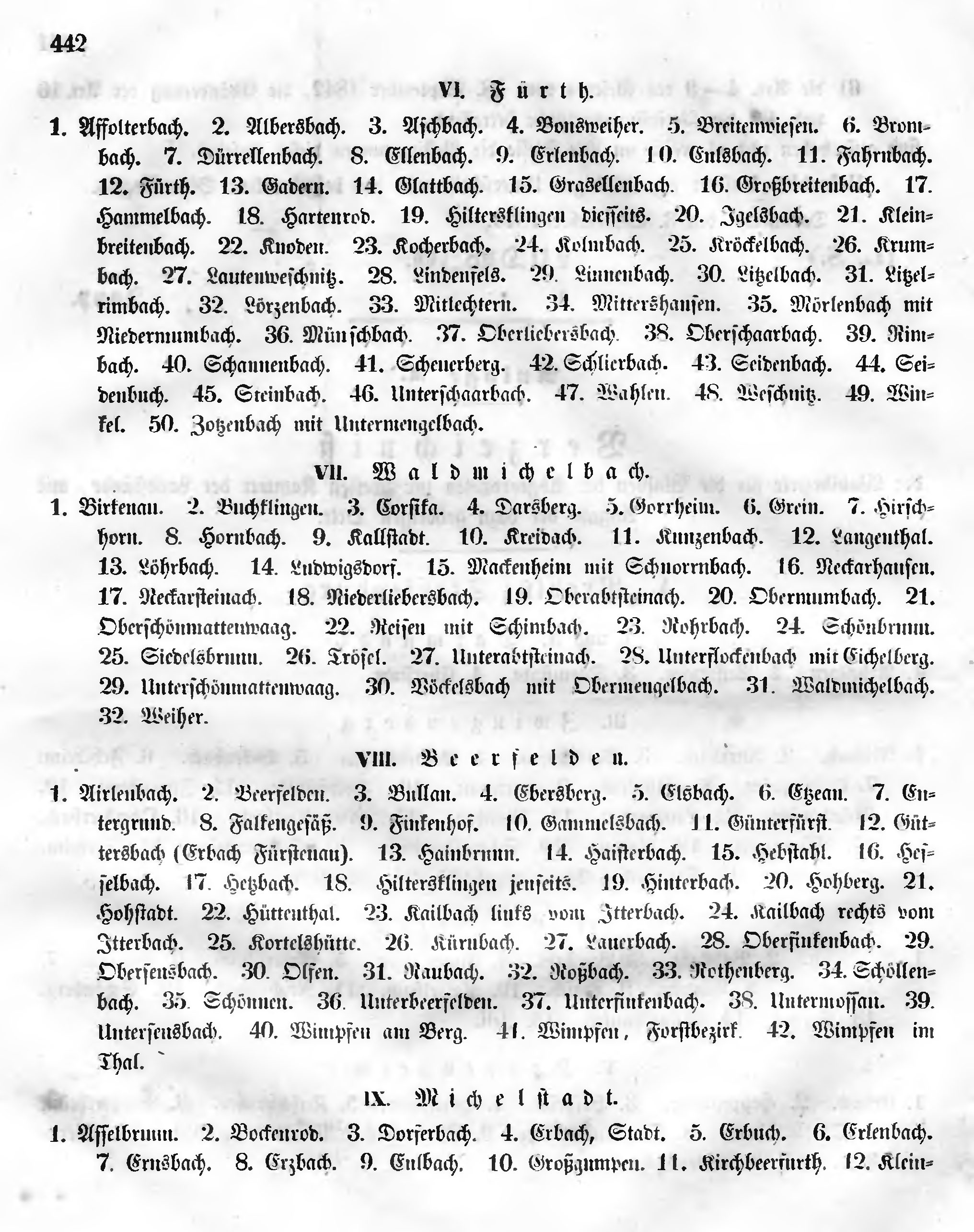 1. Airlenbach. 2. Beerfelden. 3. Bullau. 4. Ebersberg. 5. Elsbach. 6. Etzean. 7. Eutergrund. 8. Falkengesäß. 9. Finkenhof. 10. Gammelsbach. 11. Günterfürst. 12. Güttersbach (Erbach Fürstenau). 13. Hainbrunn. 14. Haisterbach. 15. Hebstahl. 16. Hesselbach. 17. Hetzbach. 18. Hiltersklingen jenseits. 19. Hinterbach. 20. Hohberg. 21. Hohstadt. 22. Hüttenthal. 23. Kailbach links vom Itterbach. 24. Kailbach rechts vom Itterbach. 25. Kortelshütte. 26. Kürnbach. 27. Lauerbach. 28. Oberfinkenbach. 29. Obersensbach. Olfen. 31. Raubach. 32. Roßbach. 33. Rothenberg. 34.Schöllenbach. 35. Schönnen. 36. Unterbeerfelden. 37. Unterfinkenbach. 38. Untermossau. 39. Untersensbach. 40. Wimpfen am Berg. 41. Wimpfen, Forstbezirk. 42. Wimpfen im Thal.