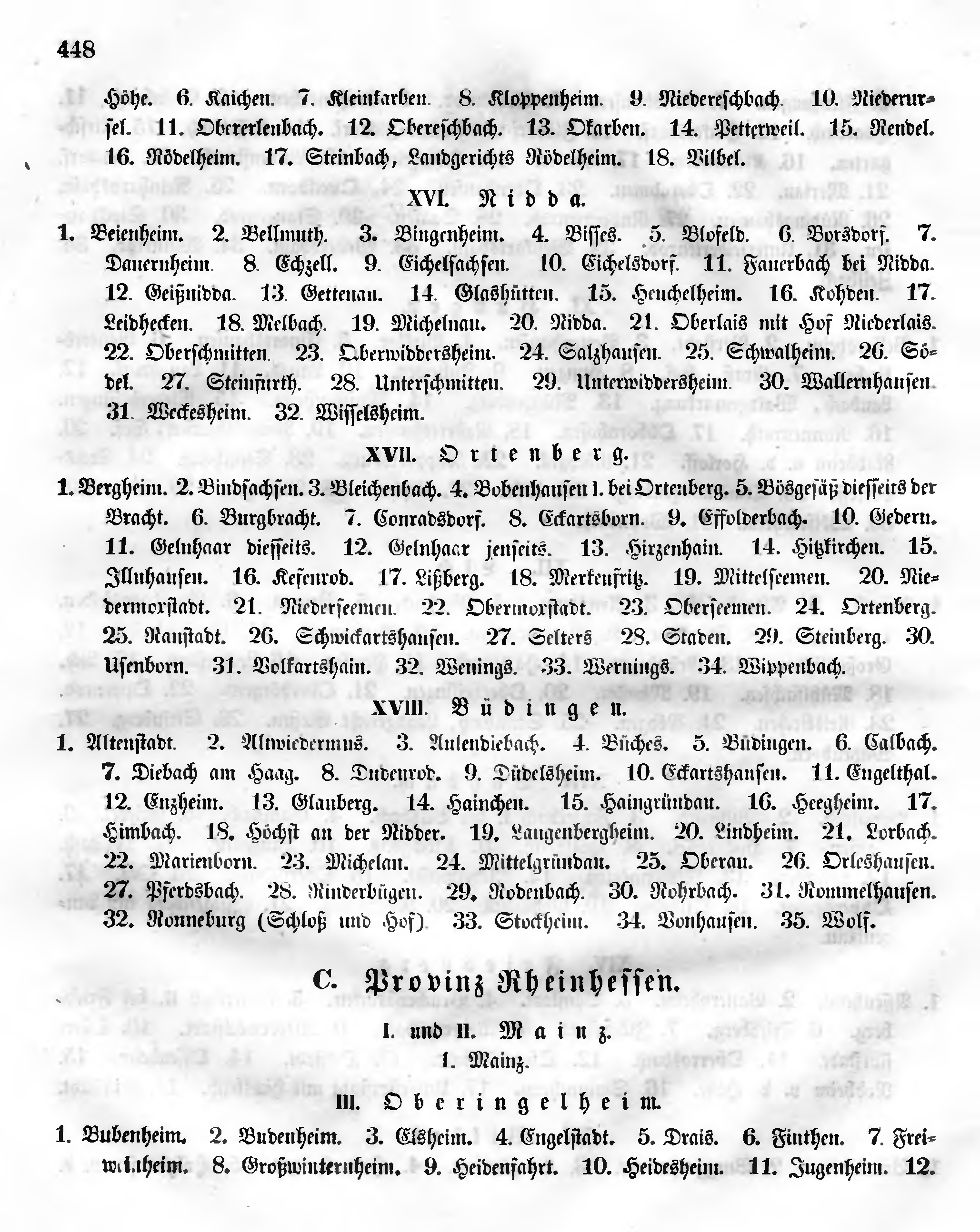 1. Bubenheim. 2. Budenheim. 3. Elsheim. 4. Engelstadt. 5. Drais. 6. Finthen. 7. Freiweinheim. 8. Großwinternheim. 9. Heidenfahrt. 10. Heidesheim. 11. Jugenheim. 12.