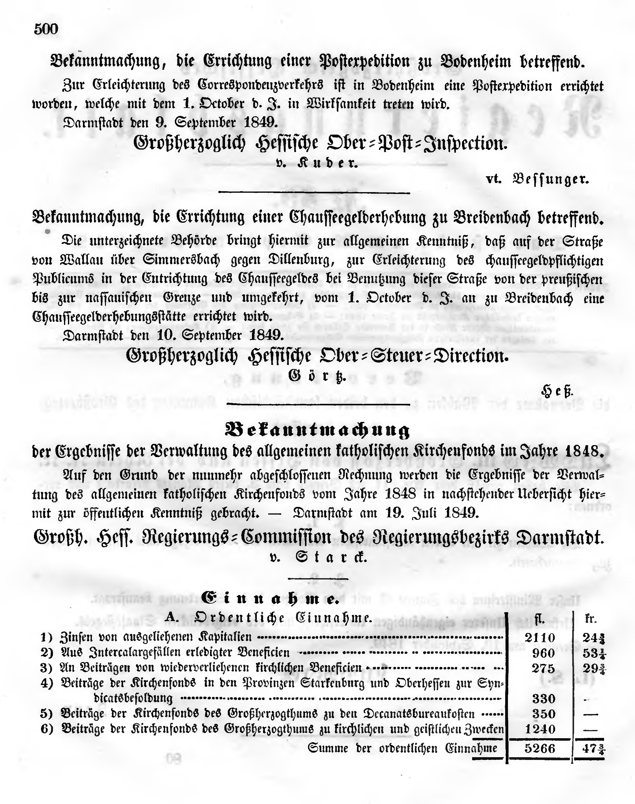 Auf den Grund der nunmehr abgeschlossenen Rechnung werden die Ergebnisse der Verwaltung des allgemeinen katholischen Kirchenfonds vom Jahre 1848 in nachstehender Uebersicht hiermit zur öffentlichen Kenntniß gebracht. - Darmstadt am 19. Juli 1849.
