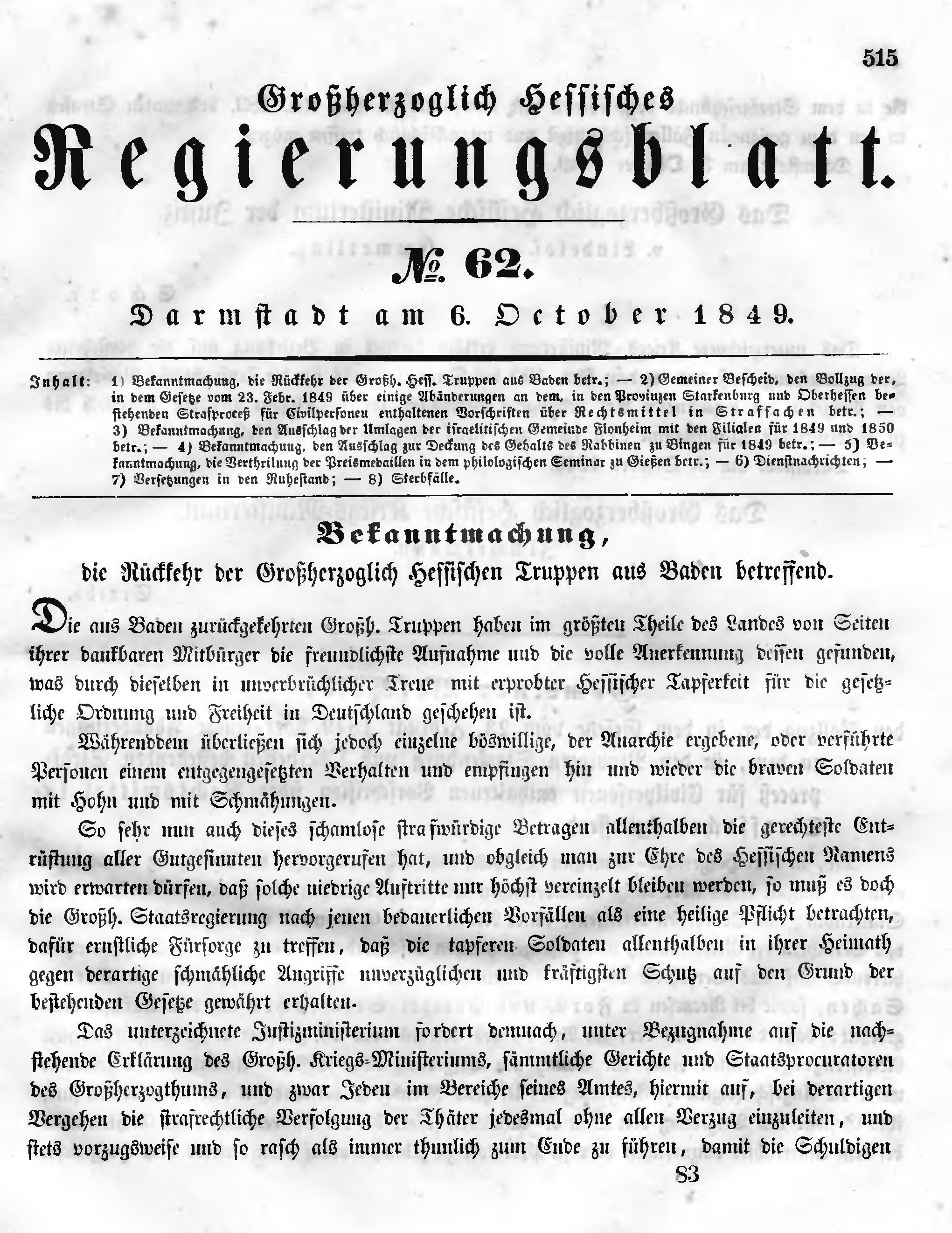 Inhalt : 1) Bekanntmachung, die Rückkehr der Großh. Hess. Truppen aus Baden betr.; - 2) Gemeiner Bescheid, den Vollzug der, in dem Gesetze vom 23. Febr. 1849 über einige Abänderungen an dem, in den Provinzen Starkenburg und Oberhessen bestehenden Strafproceß für Civilpersonen enthaltenen Vorschriften über Rechtsmittel in Strafsachen betr.; - 3) Bekanntmachung, den Ausschlag der Umlagen der israelitischen Gemeinde Flonheim mit den Filialen für 1849 und 1850 betr.; - 4) Bekanntmachung, den Ausschlag zur Deckung des Gehalts des Rabbinen zu Bingen für t849 betr.; - 5) Bekanntmachung, die Vertheilung der Preismedaillen in dem philologischen Seminar zu Gießen betr.; - 6) Dienstnachrichten; - 7) Versetzungen in den Ruhestand; - 8) Sterbfälle.