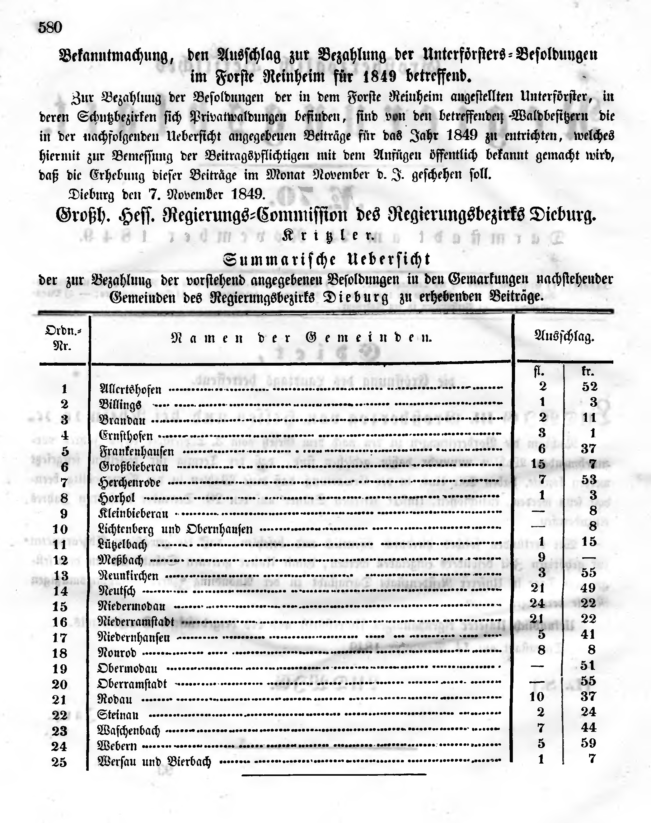 Zur Bezahlung der Besoldungen der in dem Forste Reinheim angestellten Unterförster, in deren Schutzbezirken sich Privatwaldungen befinden, sind von den betreffenden Waldbesitzern die in der nachfolgenden Uebersicht angegebenen Beiträge für das Jahr 1849 zu entrichten, welches hiermit zur Bemessung der Beitragspflichtigen mit dem Anfügen öffentlich bekannt gemacht wird, daß die Erhebung dieser Beiträge im Monat November d. J. geschehen soll.