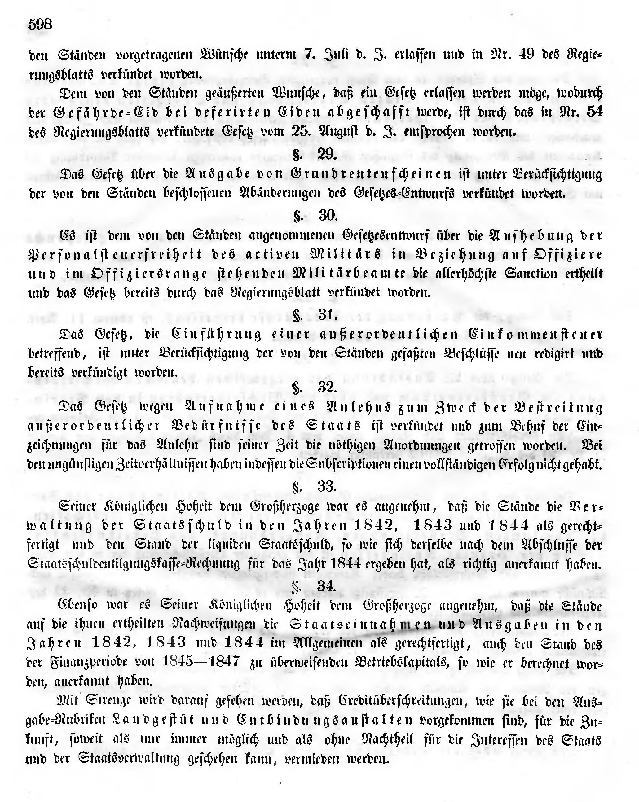 Seiner Königlichen Hoheit dem Großherzoge war es angenehm, daß die Stände die Verwaltung der Staatsschuld in den Jahren 1842, 1843 und 1844 als gerechtfertigt und den Stand der liquiden Staatsschuld, so wie sich derselbe nach dem Abschlusse der Staatsschuldentilgungskasse-Rechnung für das Jahr 1844 ergeben hat, als richtig anerkannt haben.