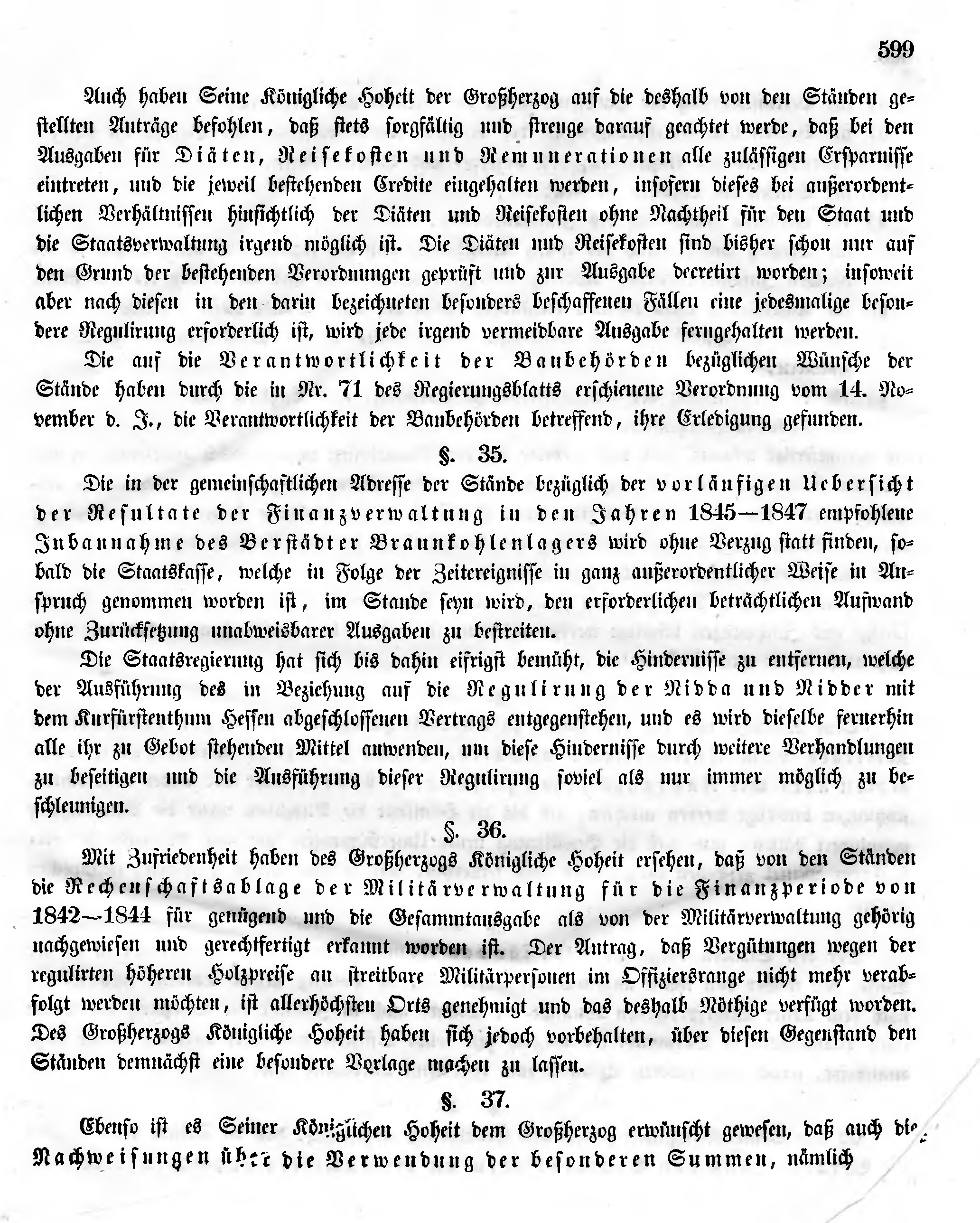 Mit Zufriedenheit haben des Großherzogs Königliche Hoheit ersehen, daß von den Ständen die Rechenschaftsablage der Militärverwaltung für die Finanzperiode von 1842-1844 für genügend und die Gesammtausgabe als von der Militärverwaltung gehörig nachgewiesen und gerechtfertigt erkannt worden ist. Der Antrag, daß Vergütungen wegen der regulirten höheren Holzpreise an streitbare Militärpersonen im Offiziersrange nicht mehr verabfolgt werden möchten, ist allerhöchsten Orts genehmigt und das deshalb Nöthige verfügt worden. Des Großherzogs Königliche Hoheit haben sich jedoch vorbehalten, über diesen Gegenstand den Ständen demnächst eine besondere Vorlage machen zu lassen.
