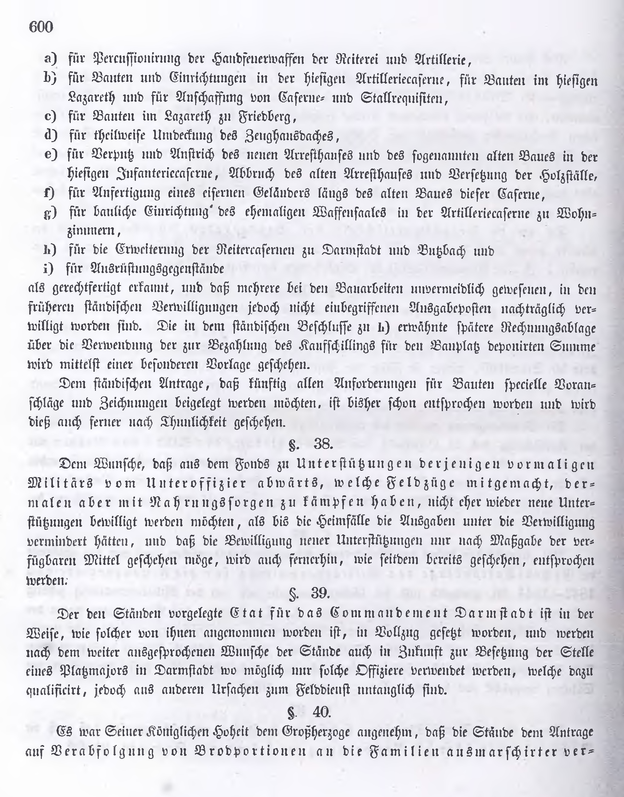 Der den Ständen vorgelegte Etat für das Commandement Darmstadt ist in der Weise, wie solcher von ihnen angenommen worden ist, in Vollzug gesetzt worden, und werden nach dem weiter ausgesprochenen Wunsche der Stände auch in Zukunft zur Besetzung der Stelle eines Platzmajors in Darmstadt wo möglich nur solche Offiziere verwendet werden, welche dazu qualificirt, jedoch aus anderen Ursachen zum Felddienst untauglich sind.