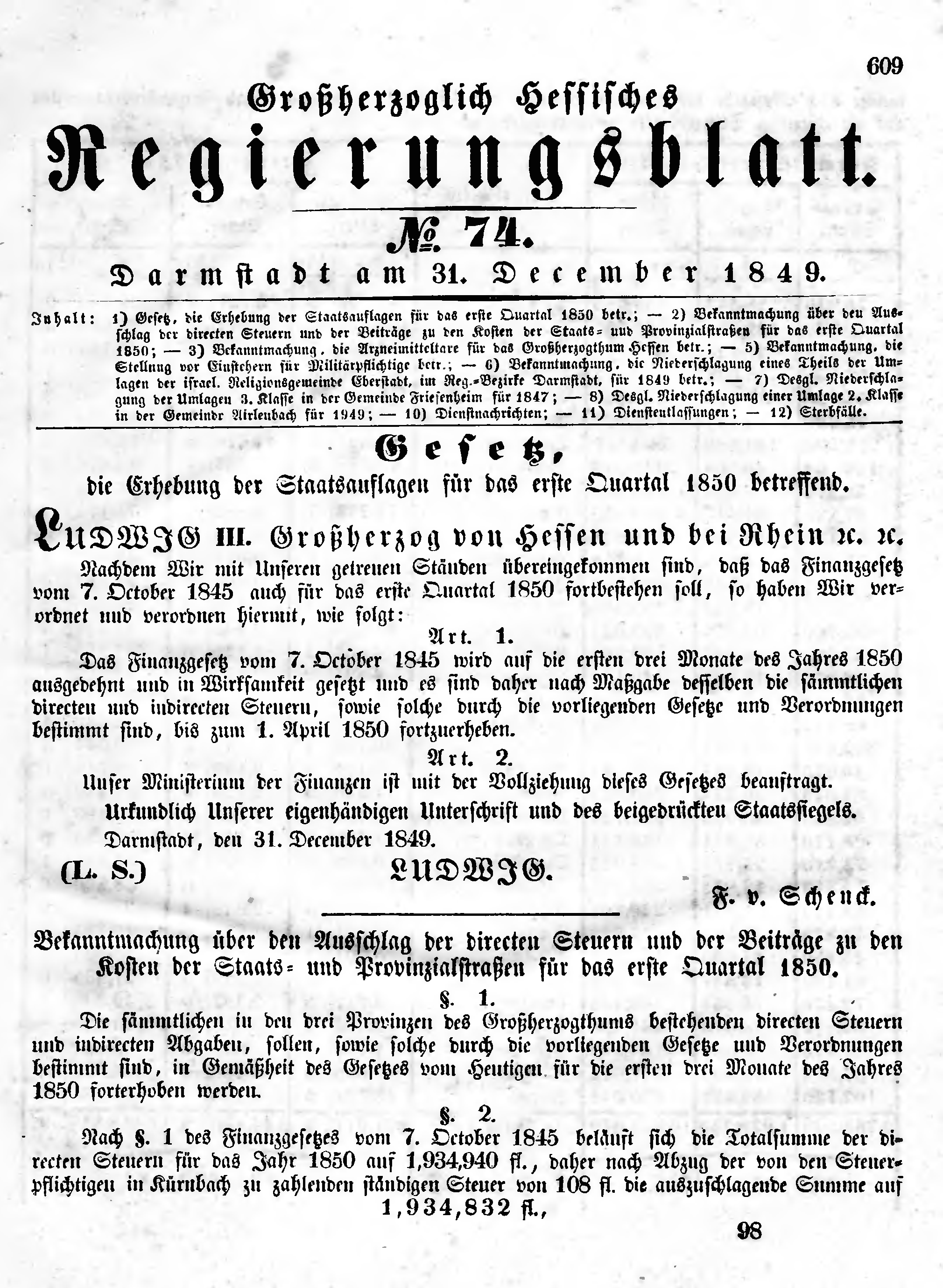 Inhalt : 1) Gesetz, die Erhebung der Staatsauslagen für das erste Quartal 1850 betr.; - 2) Bekanntmachung über den Ausschlag der directen Steuern und der Beiträge zu den Kosten der Staats- und Provinzialstraßen für das erste Quartal 1850; - 3) Bekanntmachung. die Arzneimitteltaxe für das Großherzogthum Hessen betr.; - 5) Bekanntmachung, die Stellung vor Einstehern für Militärpflichtige betr.; - 6) Bekanntmachung, die Niederschlagung eines Theils der Umlagen der israel. Religionsgemeinde Eberstadt, im Reg.-Bezirke Darmstadt, für 1849 betr.; - 7) Desgl. Niederschlagung der Umlagen 3. Klasse in der Gemeinde Friesenheim für 1847; - 8) Desgl. Niederschlagung einer Umlage 2. Klasse in der Gemeinde Airlenbach für 1949; - 10) Dienstnachrichten; - 11) Dienstentlassungen; - 12) Sterbfälle.