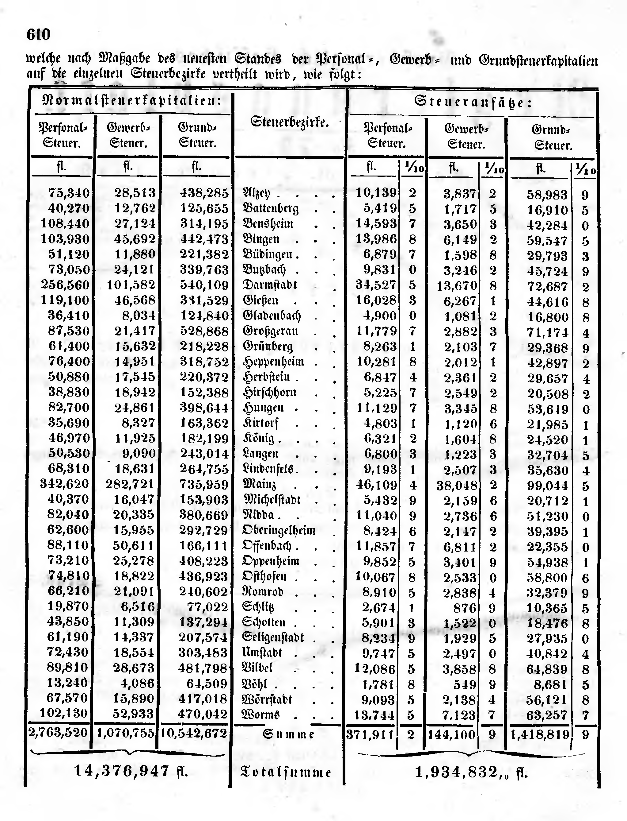 welche nach Maßgabe des neuesten Standes der Personal-, Gewerb- und Grundsteuerkapitalien auf die einzelnen Steuerbezirke vertheilt wird, wie folgt: