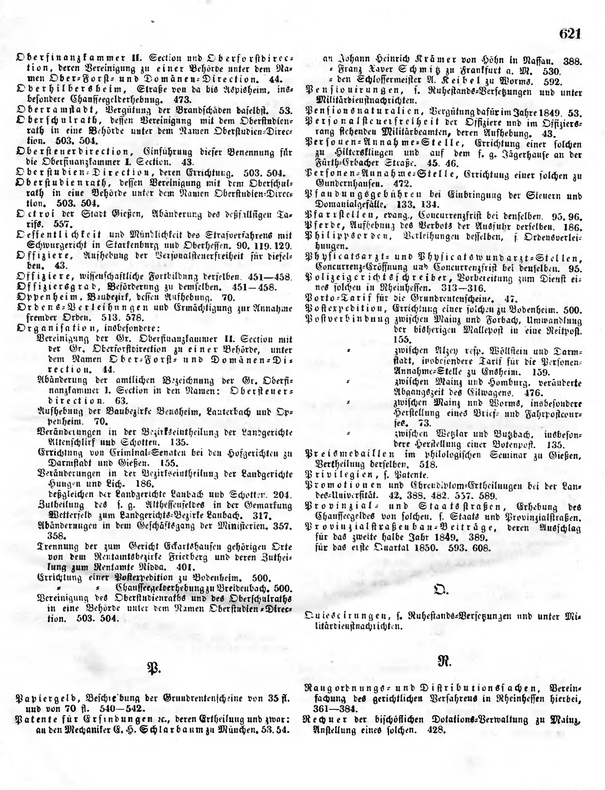 | Oberfinanzkammer II. Section und Oberforstdirection, deren Vereinigung zu einer Behörde unter dem Namen Ober-Forst- und Domänen-Direction. 44. Oberhilbersheim, Straße von da bis Aspisheim, insbesondere Chausseegelderhebung. 473. Oberramstadt, Vergütung der Brandschäden daselbst. 53. Oberschulrath, dessen Vereinigung mit dem Oberstudienrath in eine Behörde unter dem Namen Oberstudien-Direction. 503. 504. Obersteuerdirection, Einführung dieser Benennung für die Oberfinanzkammer I. Section. 43. Oberstudien-Direction, deren Errichtung. 503. 504. Oberstudienrath, dessen Vereinigung mit dem Oberschulrath in eine Behörde unter dem Namen Oberstudien-Direction. 503. 504. Octroi der Stadt Gießen, Abänderung des deßfallsigen Tarifs. 557. Oeffentlichkeit und Mündlichkeit des Strafverfahrens mit Schwurgericht in Starkenburg und Oberhessen. 90. 119.120. Offiziere, Aufhebung der Personalsteuerfreiheit für dieselben. 43. Offiziere, wissenschaftliche Fortbildung derselben. 451-458. Offiziersgrad, Beförderung zu demselben. 451-458. Oppenheim, Baubezirk, dessen Aufhebung. 70. Ordens-Verleihungen und Ermächtigung zur Annahme fremder Orden. 513. 578. Organisation, insbesondere: Vereinigung der Gr. Oberfinanzkammer II. Section mit der Gr. Oberforstdirection zu einer Behörde, unter dem Namen Ober-Forst- und Domänen-Direction. 44. Abänderung der amtlichen Bezeichnung der Gr. Oberfinanzkammer I. Section in den Namen: Obersteuerdirection. 63. Aufhebung der Baubezirke Bensheim, Lauterbach und Oppenheim. 70. Veränderungen in der Bezirkseintheilung der Landgerichte Altenschlirf und Schotten. 135. Errichtung von Criminal-Senaten bei den Hofgerichten zu Darmstadt und Gießen. 155. Veränderungen in der Bezirkseintheilung der Landgerichte Hungen und Lich. 186. deßgleichen der Landgerichte Laubach und Schotten. 204. Zutheilung des s. g. Althessenfeldes in der Gemarkung Wetterfeld zum Landgerichts-Bezirke Laubach. 317. Abänderungen in dem Geschäftsgang der Ministerien. 357. 358. Trennung der zum Gericht Eckartshausen gehörigen Orte von dem Rentamtsbezirke Friedberg und deren Zutheilung zum Rentamte Nidda. 401. Errichtung einer Postexpedition zu Bodenheim. 500. Errichtung einer Chausseegelderhebung zu Breidenbach. 500. Vereinigung des Oberstudienraths und des Oberschulraths in eine Behörde unter dem Namen Oberstudien-Direction. 503. 504. Papiergeld, Beschreibung der Grundrentenscheine von 35 fl. und von 70 fl. 540-542. Patente für Erfindungen etc., deren Ertheilung und zwar: an den Mechaniker E- H. Schlarbaum zu München. 53. 54. |