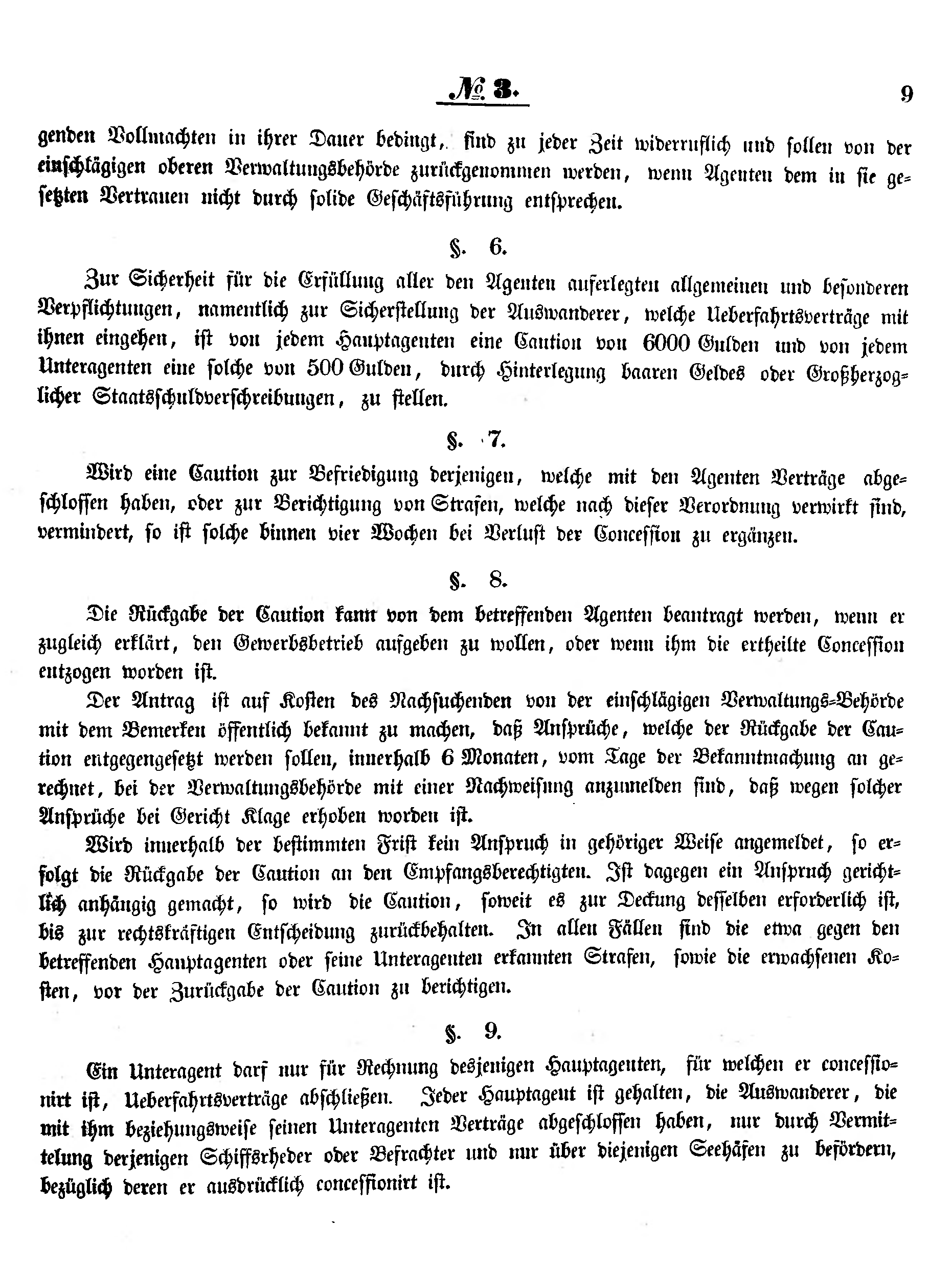 Zur Sicherheit für die Erfüllung aller den Agenten auferlegten allgemeinen und besonderen Verpflichtungen, namentlich zur Sicherstellung der Auswanderer, welche Ueberfahrtsverträge mit ihnen eingehen, ist von jedem Hauptagenten eine Caution von 6000 Gulden und von jedem Unteragenten eine solche von 500 Gulden, durch Hinterlegung baaren Geldes oder Großherzoglicher Staatsschuldverschreibungen, zu stellen.