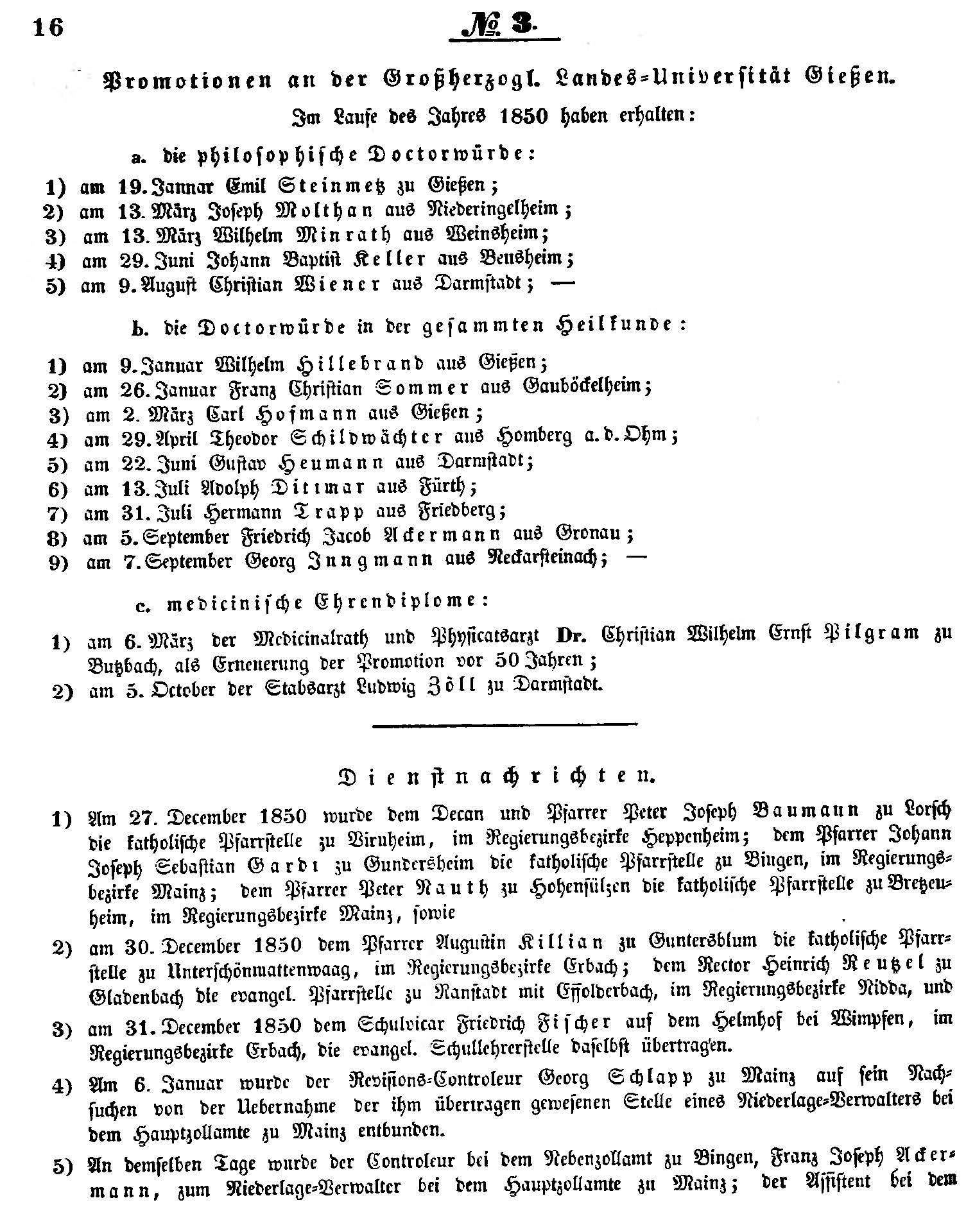 1) Am 27. December 1850 wurde dem Decan und Pfarrer Peter Joseph Baumann zu Lorsch die katholische Pfarrstelle zu Virnheim, im Regierungsbezirke Heppenheim; dem Pfarrer Johann Joseph Sebastian Gardt zu Gundersheim die katholische Pfarrstelle zu Bingen, im Regierungsbezirke Mainz; dem Pfarrer Peter Nauth zu Hohensülzen die katholische Pfarrstelle zu Bretzenheim, im Regierungsbezirke Mainz, sowie