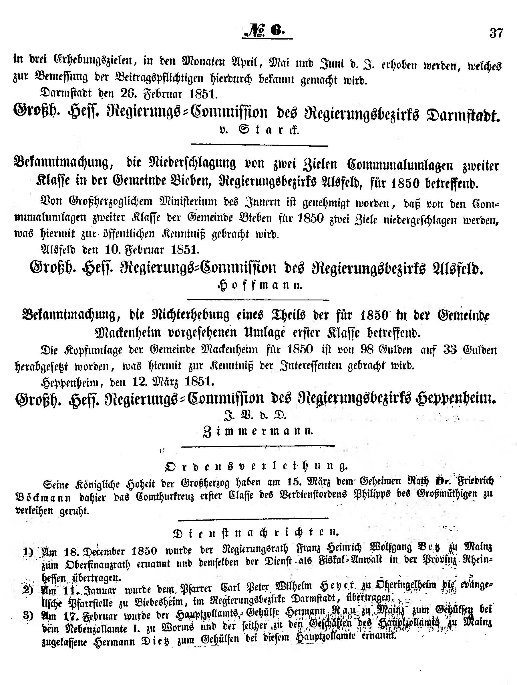 1) Am 18. December 1850 wurde der Regierungsrath Franz Heinrich Wolfgang Betz zu Mainz zum Oberfinanzrath ernannt und demselben der Dienst als Fiskal-Anwalt in der Provinz Rheinhessen übertragen.