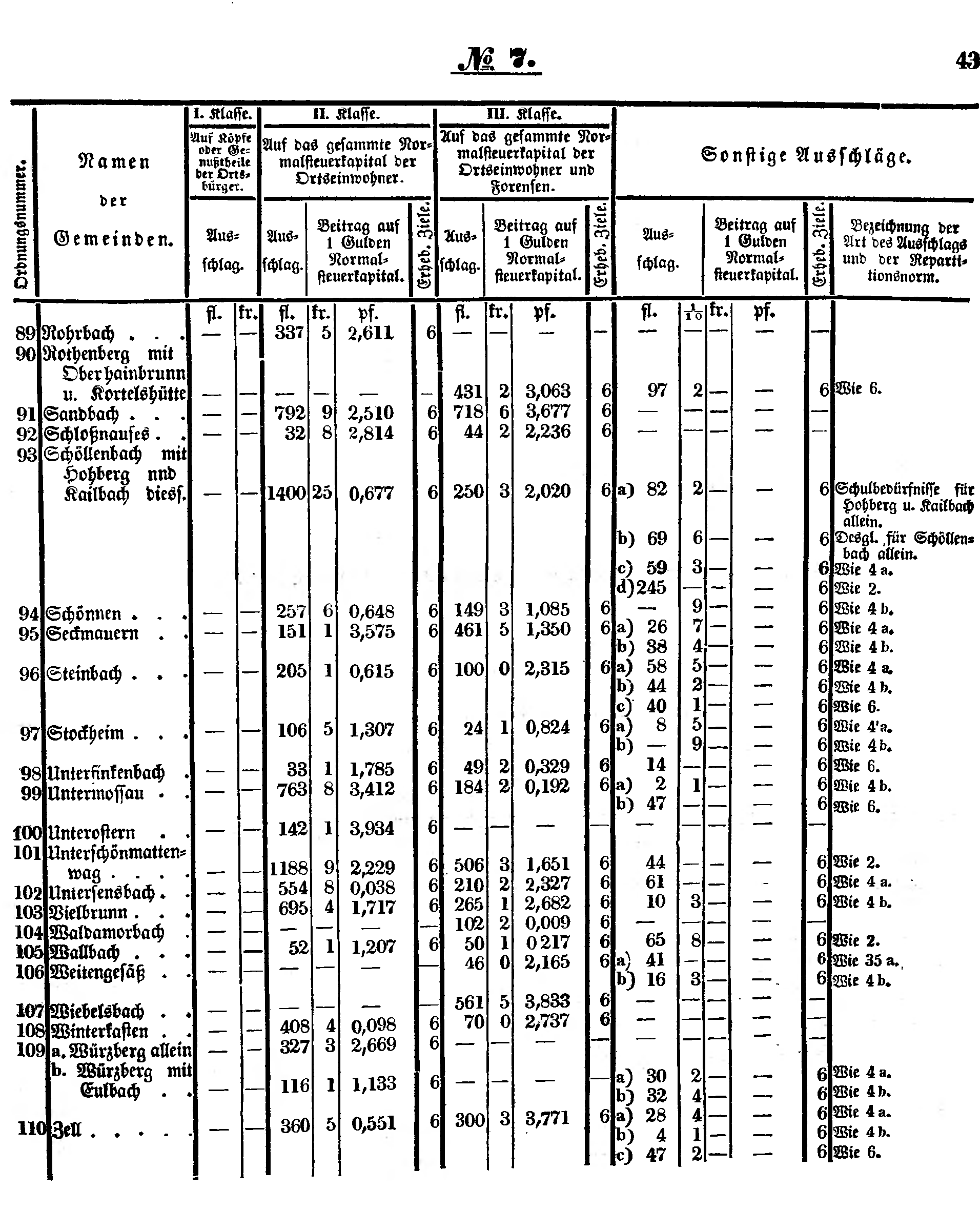 | Auf Köpfe oder Genußtheile der Ortsbürger. | Auf das gesammte Normalsteuerkapital der Ortseinwohner. | Auf das gesammte Normalsteuerkapital der Ortseinwohner und Forensen. | |||||||||||||||