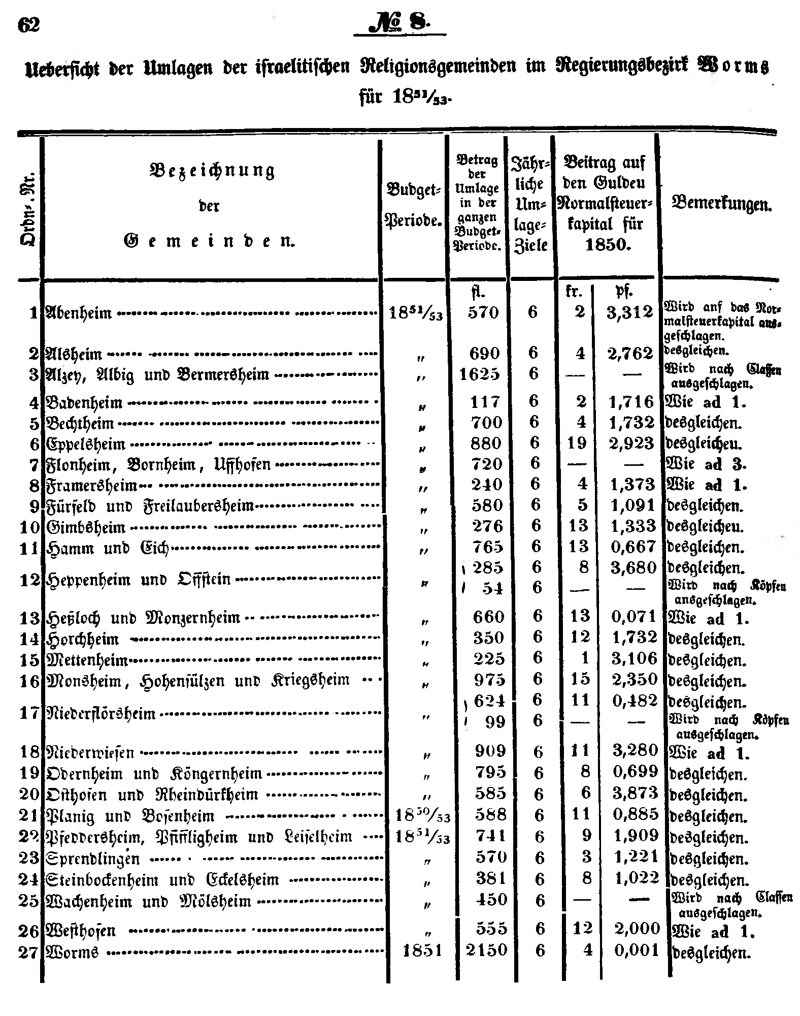 Uebersicht der Umlagen der israelitischen Religionsgemeinden im Regierungsbezirk Worms für 1851/53.
