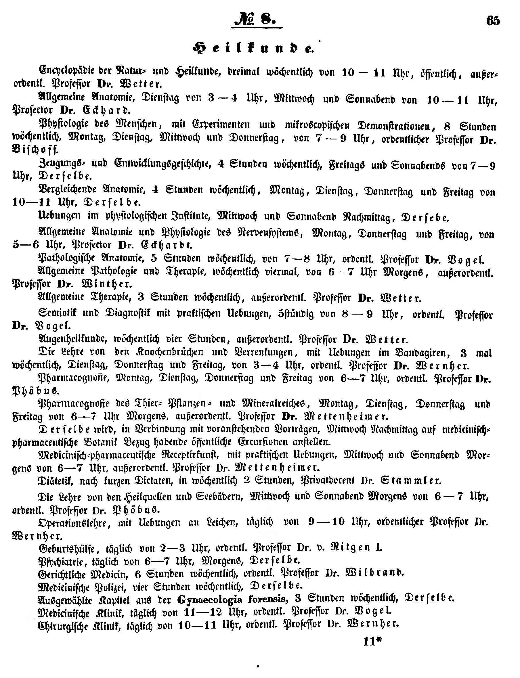 Physiologie des Menschen, mit Experimenten und mikroscopischen Demonstrationen, 8 Stunden wöchentlich, Montag, Dienstag, Mittwoch und Donnerstag, von 7-9 Uhr, ordentlicher Professor Dr. Bischoff.