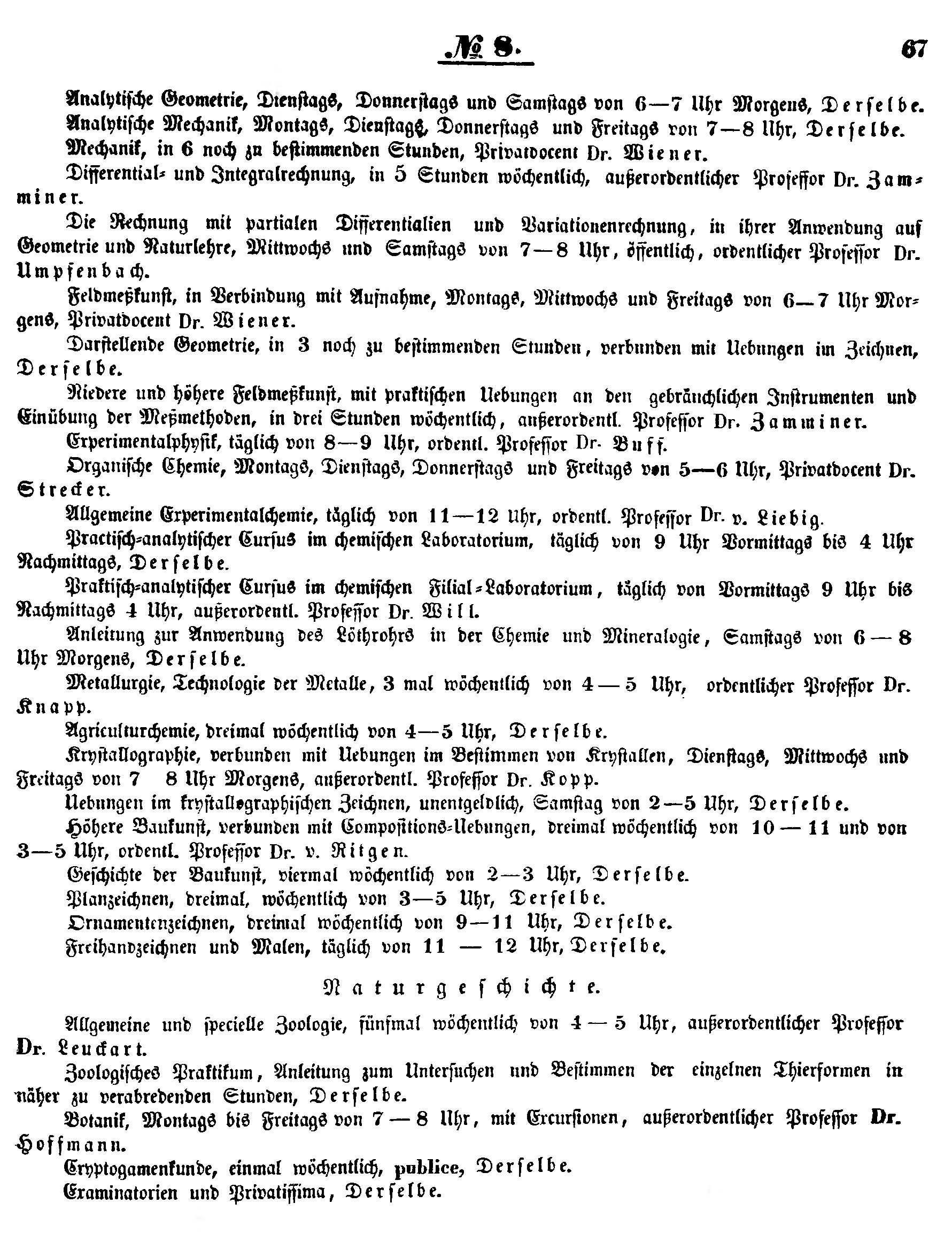 Allgemeine Experimentalchemie, täglich von 11-12 Uhr, ordentl. Professor Dr. v. Liebig.