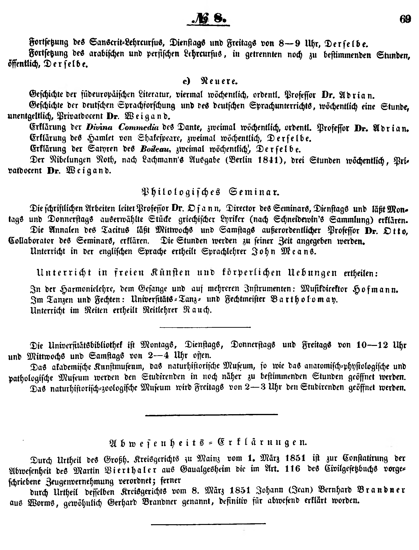 Die schriftlichen Arbeiten leitet Professor Dr. Osann, Director des Seminars, Dienstags und läßt Montags und Donnerstags auserwählte Stücke griechischer Lyriker ( nach Schneidewin`s Sammlung) erklären.