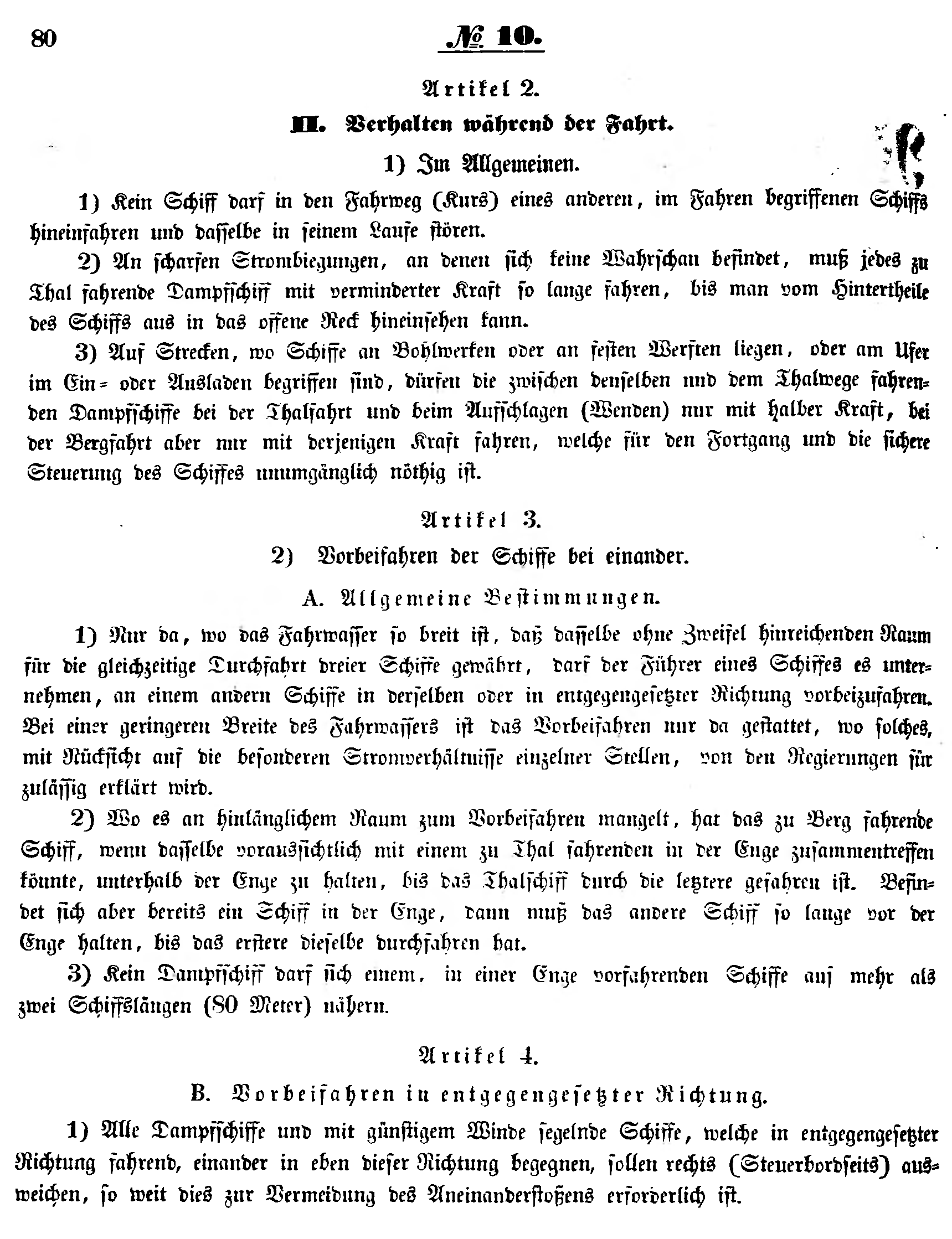 - 1) Kein Schiff darf in den Fahrweg (Kurs) eines anderen, im Fahren begriffenen Schiffs hineinfahren und dasselbe in seinem Laufe stören.
