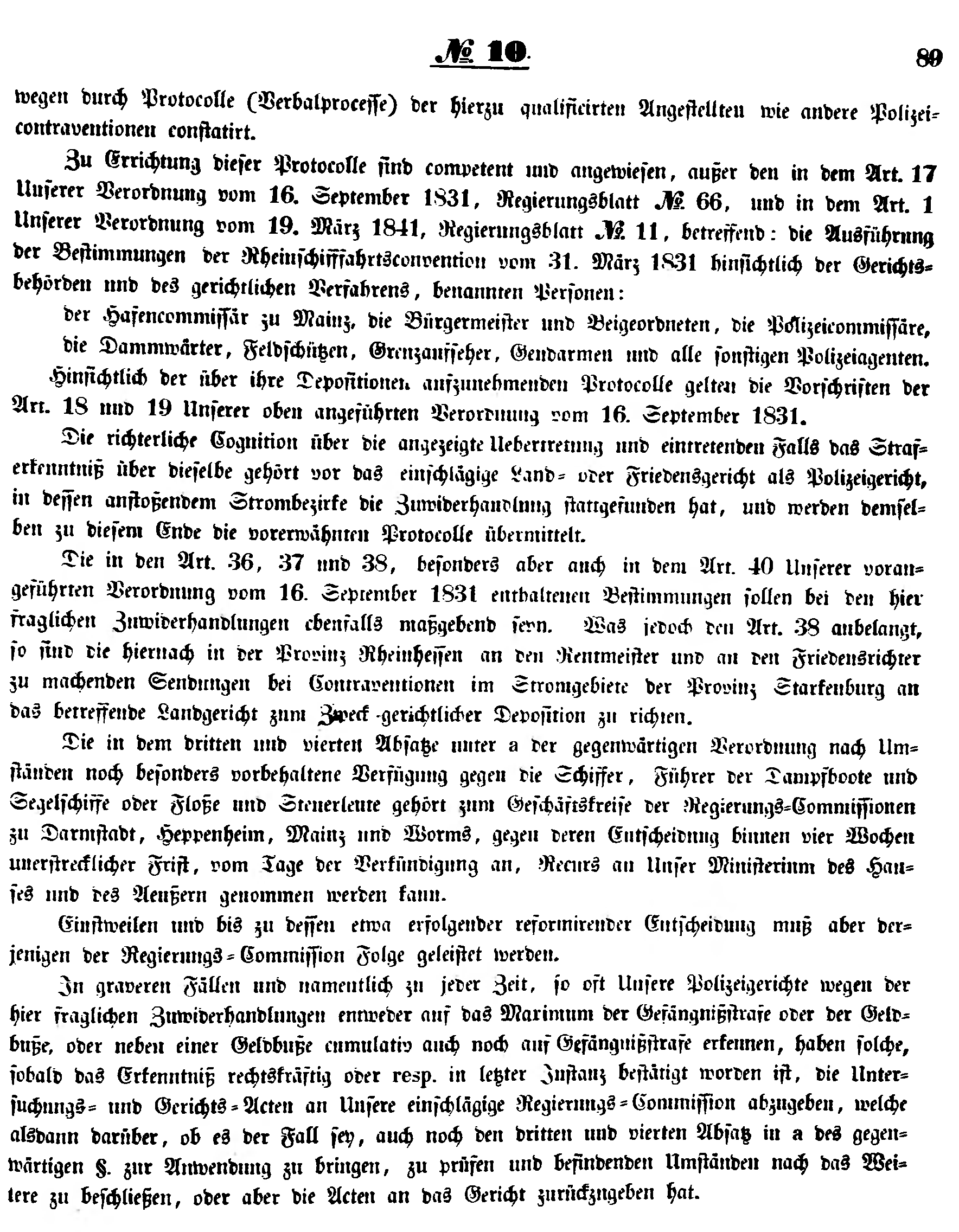- Die in den Art. 36, 37 und 38, besonders aber auch in dem Art. 40 Unserer vorangeführten Verordnung vom 16. September 1831 enthaltenen Bestimmungen sollen bei den hier fraglichen Zuwiderhandlungen ebenfalls maßgebend seyn. Was jedoch den Art. 38 anbelangt, so sind die hiernach in der Provinz Rheinhessen an den Rentmeister und an den Friedensrichter zu machenden Sendungen bei Contraventionen im Stromgebiete der Provinz Starkenburg an das betreffende Landgericht zum Zweck gerichtlicher Deposition zu richten.