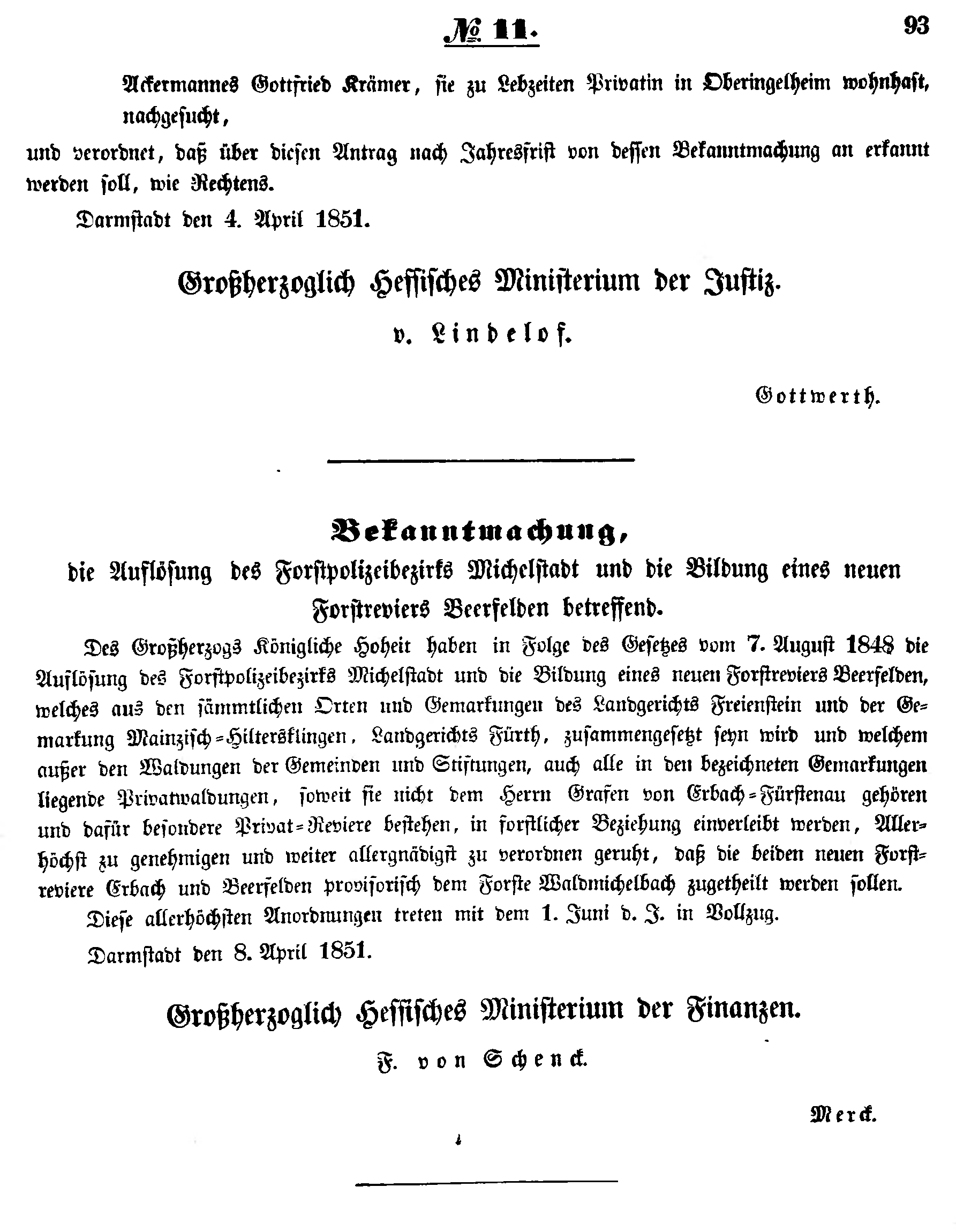 Des Großherzogs Königliche Hoheit haben in Folge des Gesetzes vom 7. August 1848 die Auflösung des Forstpolizeibezirks Michelstadt und die Bildung eines neuen Forstreviers Beerfelden, welches aus den sämmtlichen Orten und Gemarkungen des Landgerichts Freienstein und der Gemarkung Mainzisch-Hiltersklingen, Landgerichts Fürth, zusammengesetzt seyn wird und welchem außer den Waldungen der Gemeinden und Stiftungen, auch alle in den bezeichneten Gemarkungen liegenden Privatwaldungen, soweit sie nicht dem Herrn Grafen von Erbach-Fürstenau gehören und dafür besondere Privat-Reviere bestehen, in forstlicher Beziehung einverleibt werden, Allerhöchst zu genehmigen und weiter allergnädigst zu verordnen geruht, daß die beiden neuen Forstreviere Erbach und Beerfelden provisorisch dem Forste Waldmichelbach zugetheilt werden sollen.