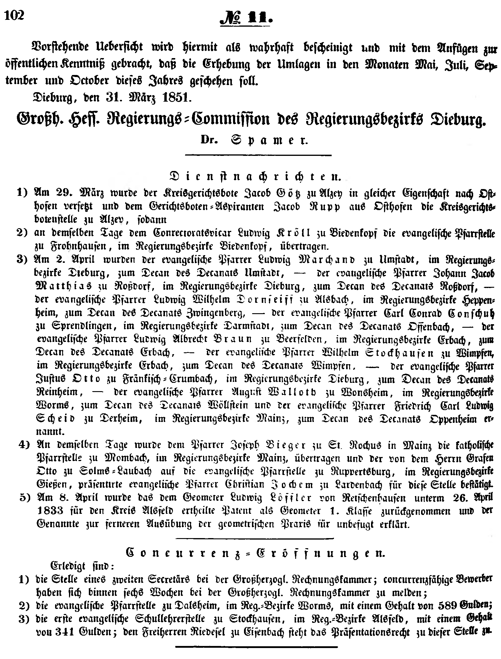 3) Am 2. April wurden der evangelische Pfarrer Ludwig Marchand zu Umstadt, im Regierungsbezirke Dieburg, zum Decan des Decanats Umstadt, - der evangelische Pfarrer Johann Jacob Matthias zu Rossdorf, im Regierungsbezirke Dieburg, zum Decan des Decanats Rossdorf, - der evangelische Pfarrer Ludwig Wilhelm Dornseiff zu Alsbach, im Regierungsbezirke Heppenheim, zum Decan des Decanats Zwingenberg, - der evangelische Pfarrer Carl Conrad Conschuh zu Sprendlingen, im Regierungsbezirke Darmstadt, zum Decan des Decanats Offenbach, - der evangelische Pfarrer Ludwig Albrecht Braun zu Beerfelden, im Regierungsbezirke Erbach, zum Decan des Decanats Erbach, - der evangelische Pfarrer Wilhelm Stockhausen zu Wimpfen, im Regierungsbezirke Erbach, zum Decan des Decanats Wimpfen, - der evangelische Pfarrer Justus Otto zu Fränkisch-Crumbach, im Regierungsbezirke Dieburg, zum Decan des Denanats Reinheim, - der evangelische Pfarrer August Walloth zu Wonsheim, im Regierungsbezirke Worms, zum Decan des Decanats Wöllstein und der evangelische Pfarrer Friedrich Carl Ludwig Scheid zu Derheim, im Regierungsbezirke Mainz, zum Decan des Decanats Openheim ernannt.