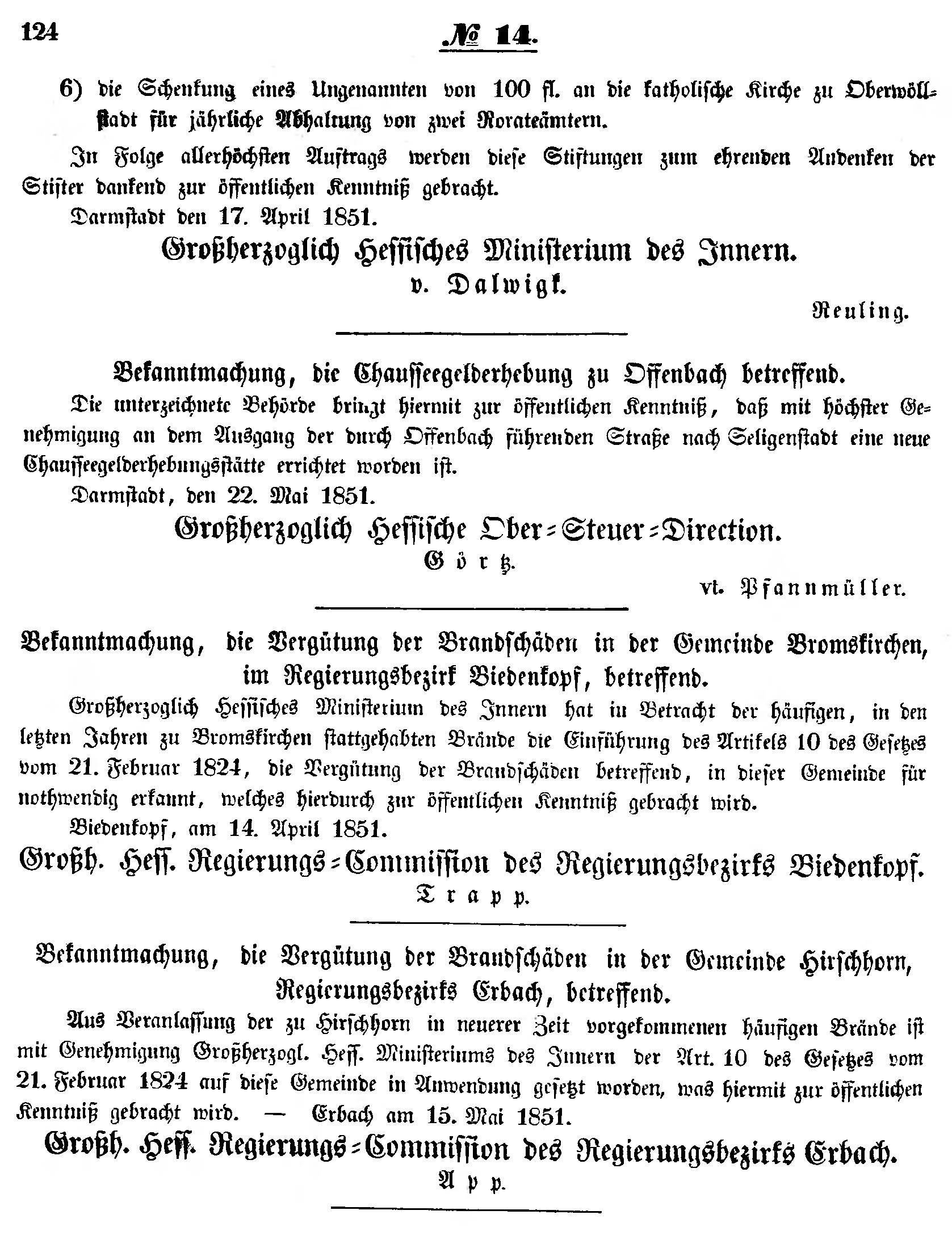 Aus Veranlassung der zu Hirschhorn in neuerer Zeit vorgekommenen häufigen Brände ist mit Genehmigung Großherzogl. Hess. Ministeriums des Innern der Art. 10 des Gesetzes vom 21. Februar 1824 auf diese Gemeinde in Anwendung gesetzt worden, was hiermit zur öffentlichen Kenntniß gebracht wird. – Erbach am 15. Mai 1851.