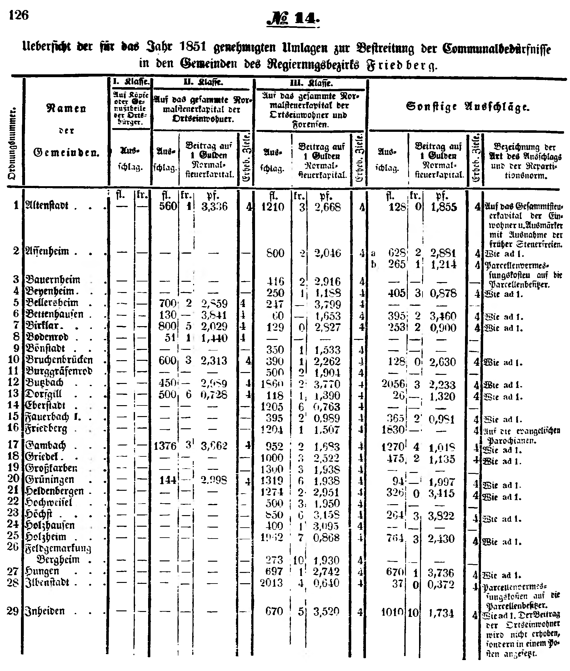 Uebersicht der für das Jahr 1851 genehmigten Umlagen zur Bestreitung der Communalbedürfnisse in den Gemeinden des Regierungsbezirks Friedberg.