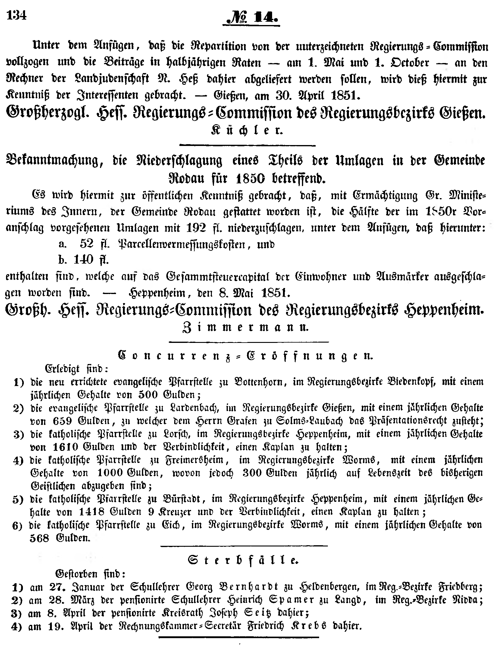 Unter dem Anfügen, daß die Repartition von der unterzeichneten Regierungs-Commission vollzogen und die Beiträge in halbjährigen Raten – am 1. Mai und 1. October – an den Rechner der Landjudenschaft N. Heß dahier abgeliefert werden sollen, wird dieß hiermit zur Kenntniß der Interessenten gebracht. – Gießen, am 30. April 1851.