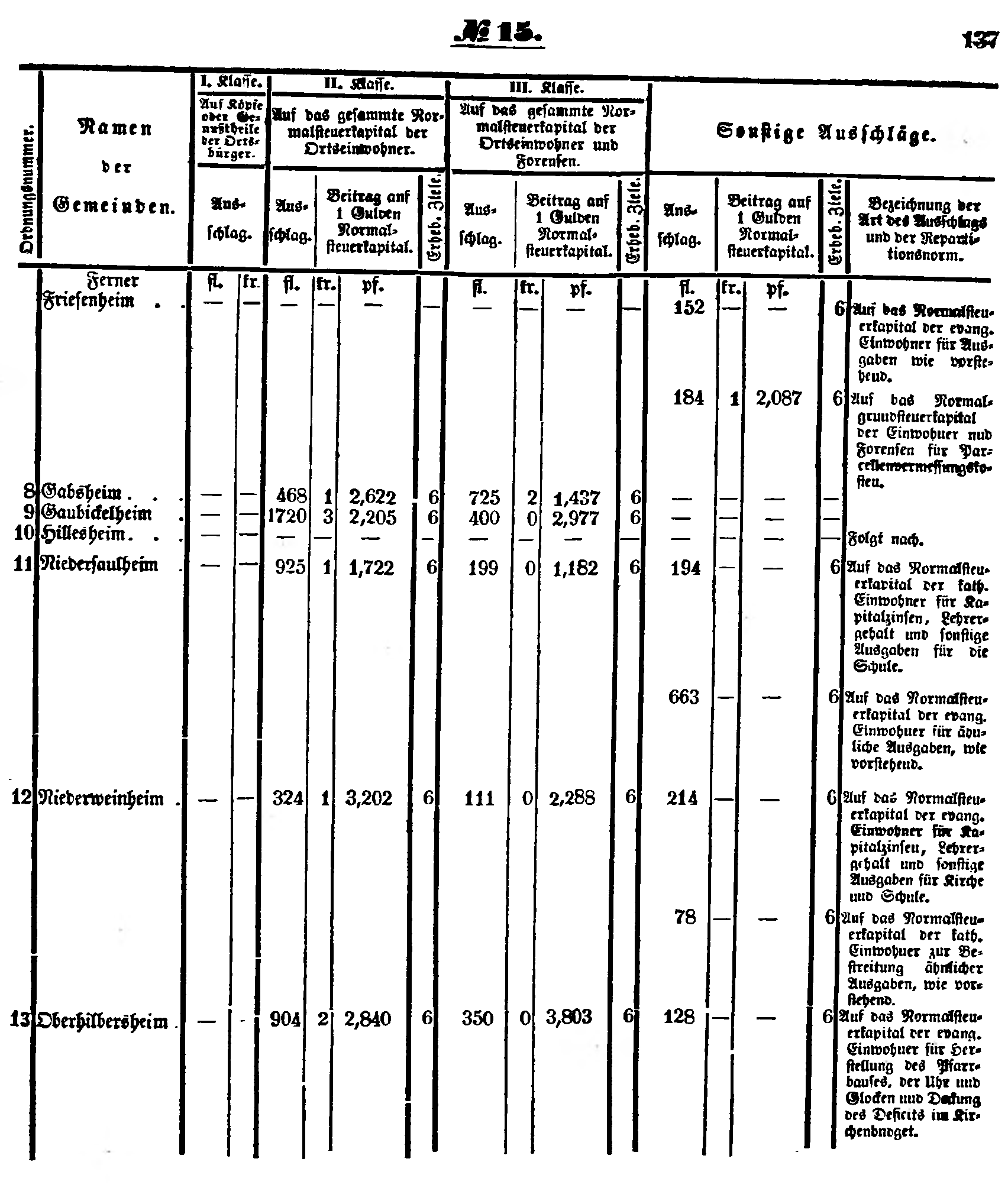 | 13 | Oberhilbersheim | - | - | 904 | 2 | 2,840 | 6 | 350 | 0 | 3,803 | 6 | 128 | - | - | 6 | Auf das Normalsteu- erkapital der ebang. Einwohner für Her- stellung des Pfarr- hauses, der Uhr und Glocken und Deckung des Deficits im Kir- chenbudget. |