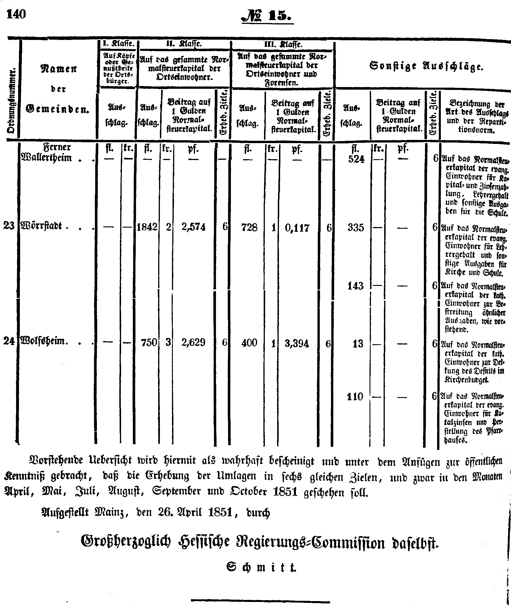 | 23 | Wörrstadt | - | - | 1842 | 2 | 2,574 | 6 | 728 | 1 | 0,117 | 6 | 335 | - | - | 6 | Auf das Normalsteuerkapital der evang. Einwohner für Lehrergehalt und sonstige Ausgaben für Kirche und Schule. |