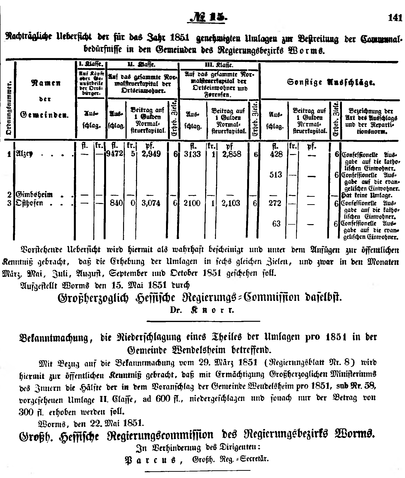 - Aufgestellt Worms den 15. Mai 1851 durch