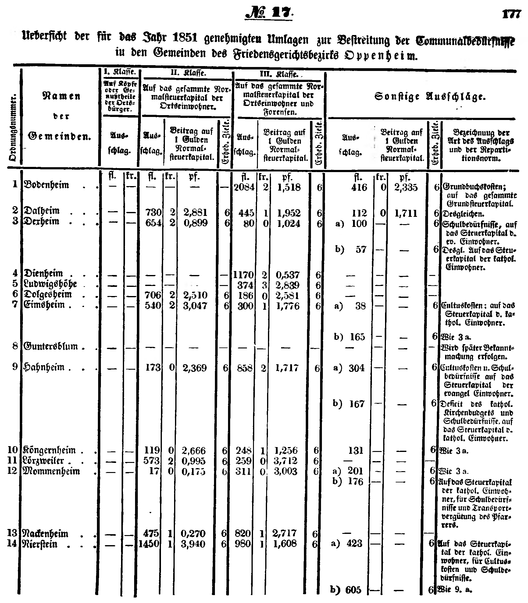 Uebersicht der für das Jahr 1851 genehmigten Umlagen zur Bestreitung der Communalbedürfnisse in den Gemeinden des Friedensgerichtsbezirks Oppenheim.