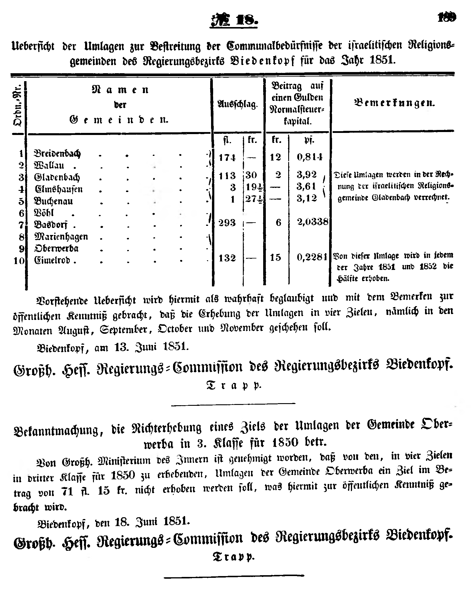 | 3 | Gladenbach | Diese Umlagen werden in der Rechnung der israelitischen Religionsgemeinde Gladenbach verrechnet. | ||||