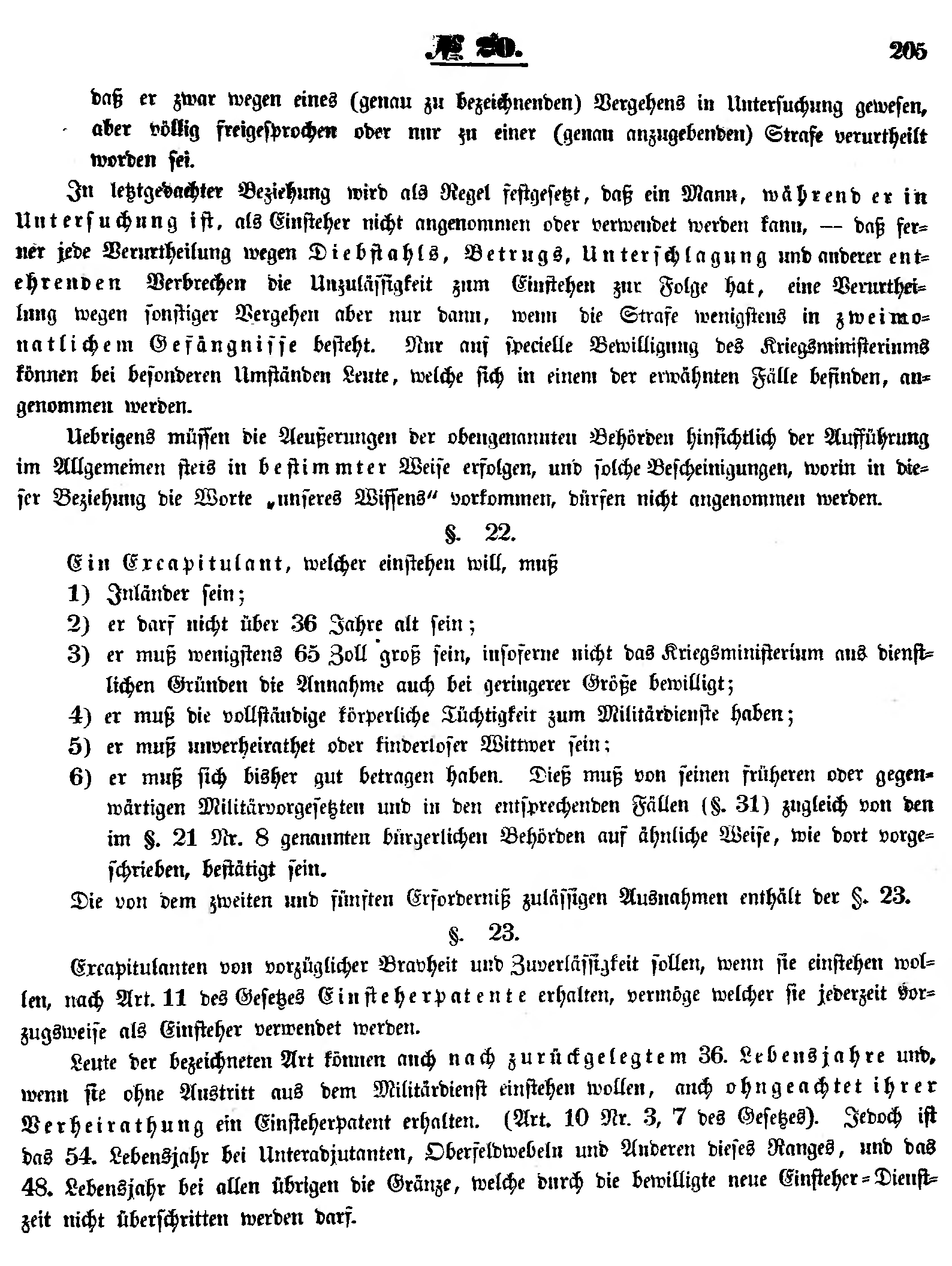 Leute der bezeichneten Art können auch nach zurückgelegtem 36. Lebensjahre und, wenn sie ohne Austritt aus dem Militärdienst einstehen wollen, auch ohngeachtet ihrer Verheirathung ein Einsteherpatent erhalten. (Art. 10 Nr. 3, 7 des Gesetzes). Jedoch ist das 54. Lebensjahr bei Unteradjutanten, Oberfeldwebeln und Anderen dieses Ranges, und das 48. Lebensjahr bei allen übrigen die Gränze, welche durch die bewilligte neue Einsteher-Dienstzeit nicht überschritten werden darf.