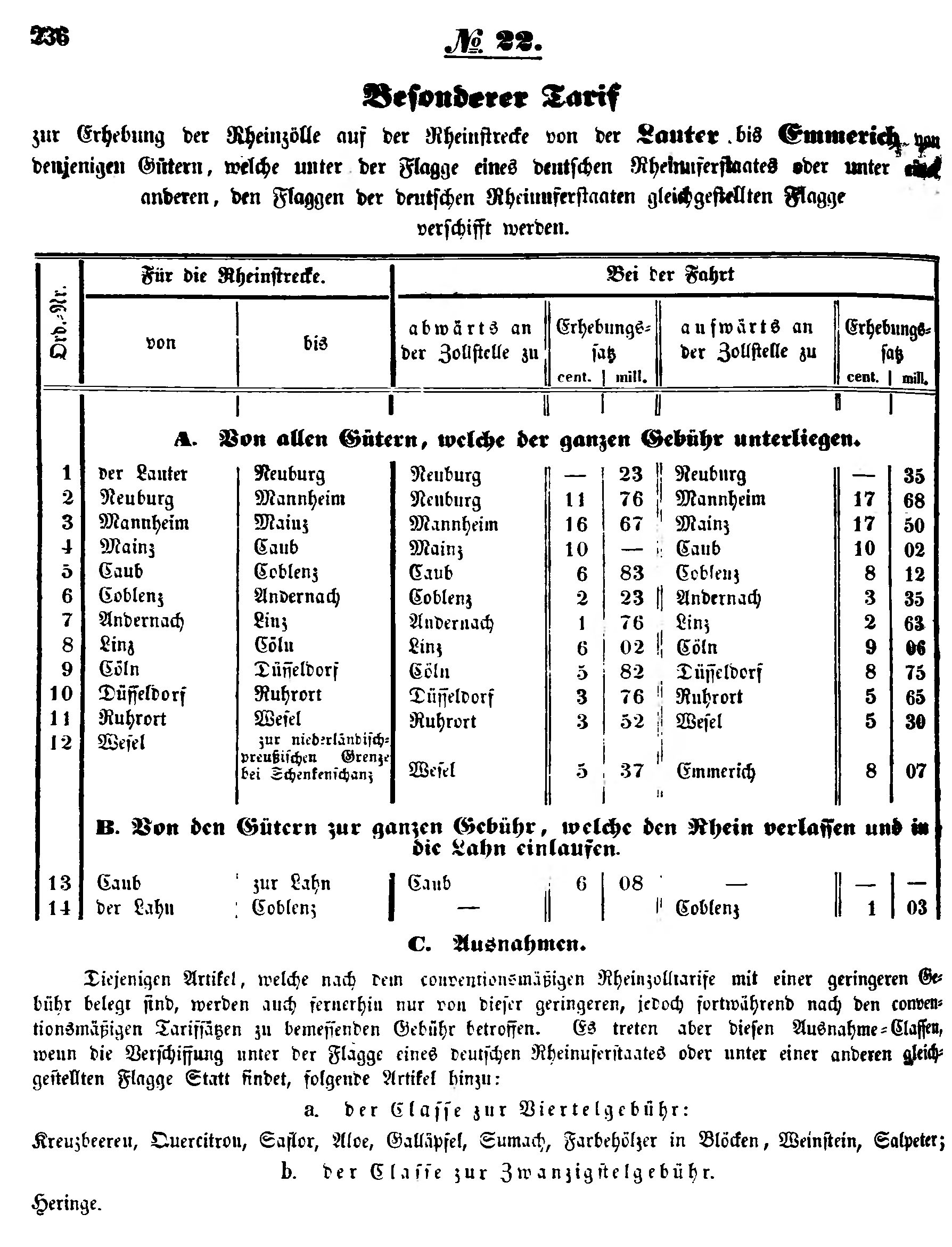 Diejenigen Artikel, welche nach dem conventionsmäßigen Rheinzolltarife mit einer geringeren Gebühr belegt sind, werden auch fernerhin nur von dieser geringeren, jedoch fortwährend nach den conventionsmäßigen Tarifsätzen zu bemessenden Gebühr betroffen. Es treten aber diesen Ausnahme-Classen, wenn die Verschiffung unter der Flagge eines deutschen Rheinuferstaates oder unter einer anderen gleichgestellten Flagge Statt findet, folgende Artikel hinzu: