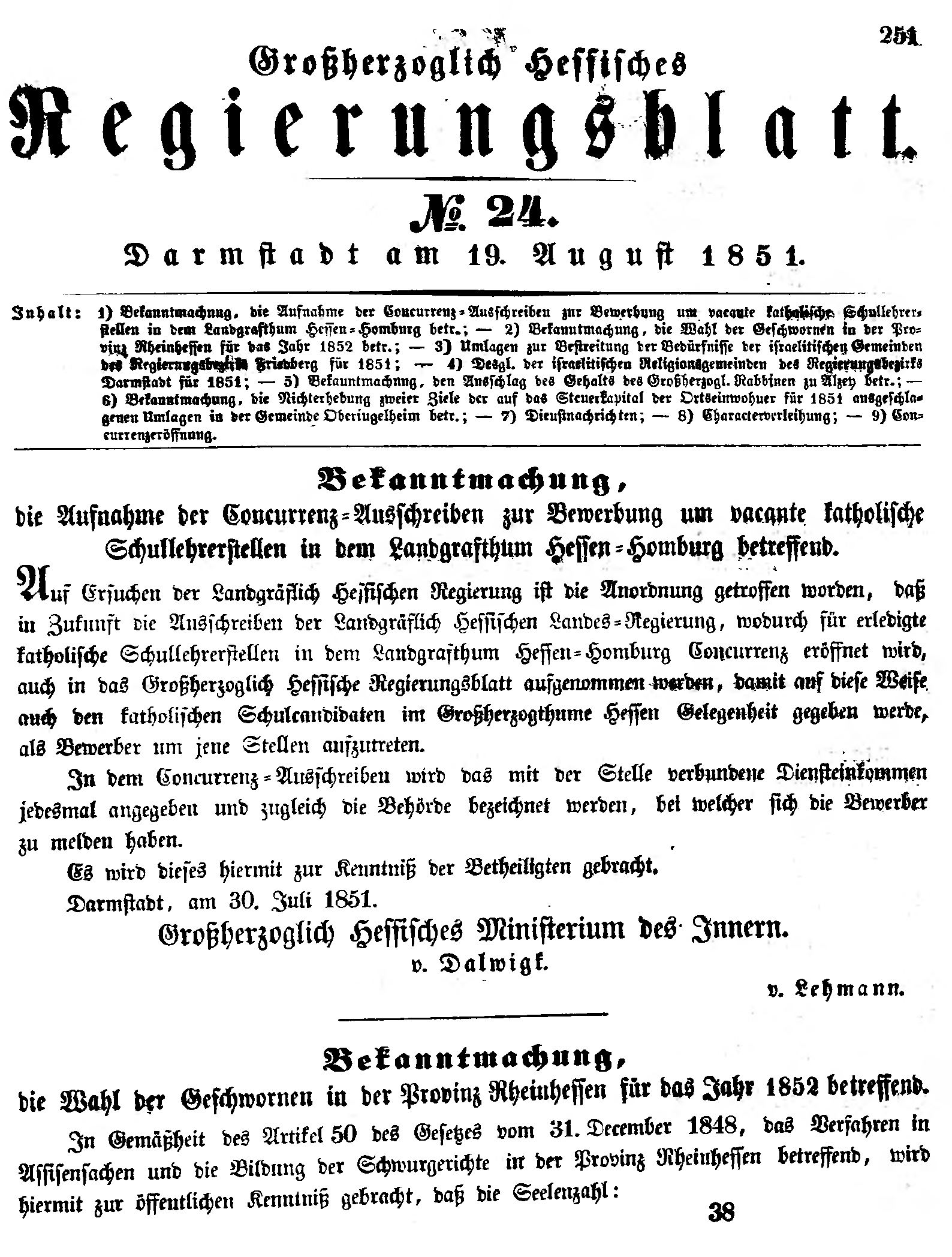 Inhalt: 1) Bekanntmachung, die Aufnahme der Concurrenz-Ausschreiben zur Bewerbung um vacante katholische Schullehrerstellen in dem Landgrafthum Hessen-Homburg betr.; - 2) Bekanntmachung, die Wahl der Geschwornen in der Provinz Rheinhessen für das Jahr 1852 betr.; - 3) Umlagen zur Bestreitung der Bedürfnisse der israelitischen Gemeinden des Regierungsbezirks Friedberg für 1851; - 4) Desgl. der israelitischen Religionsgemeinden des Regierungsbezirks Darmstadt für 1851; - 5) Bekanntmachung, den Ausschlag des Gehalts des Großherzogl. Rabbinen zu Alzey betr. - 6) Bekanntmachung, die Nichterhebung zweier Ziele der auf das Steuerkapital der Ortseinwohner für 1851 ausgeschlagenen Umlagen in der Gemeinde Oberingelheim betr. - 7) Dienstnachrichten; - 8) Characterverleihung; - 9) Concurrenzeröffnung.
