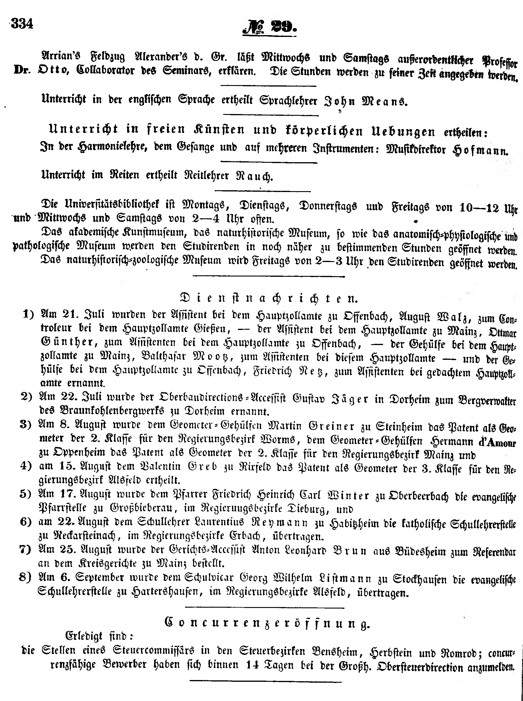 3) Am 8. August wurde dem Geometer-Gehülfen Martin Greiner zu Steinheim das Patent als Geometer der 2. Klasse für den Regierungsbezirk Worms, dem Geometer-Gehülfen Hermann d`Amour zu Oppenheim das Patent als Geometer der 2. Klasse für den Regierungsbezirk Mainz und
