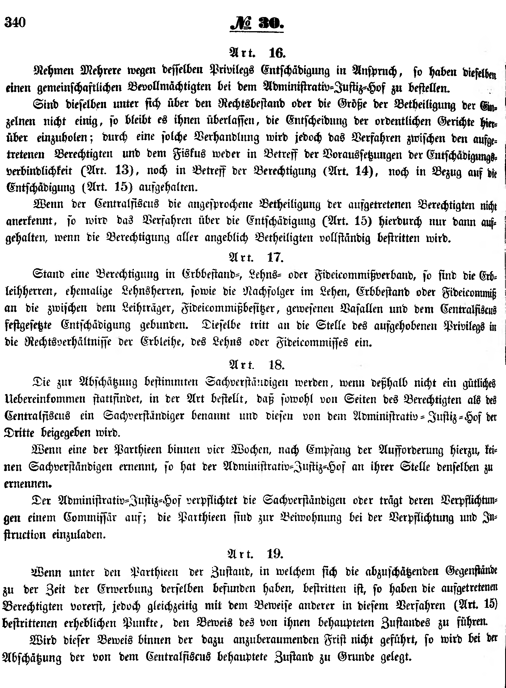 Die zur Abschätzung bestimmten Sachverständigen werden, wenn deßhalb nicht ein gütliches Uebereinkommen stattfindet, in der Art bestellt, daß sowohl von Seiten des Berechtigten als des Centralfiscus ein Sachverständiger benannt und diesen von dem Administrativ-Justiz-Hof der Dritte beigegeben wird.