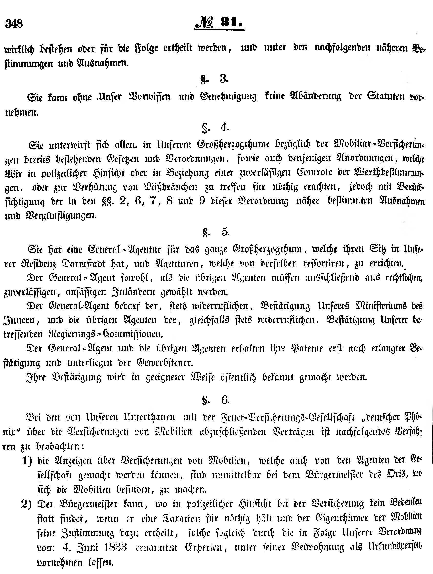 Sie unterwirft sich allen, in Unserem Großherzogthume bezüglich der Mobiliar-Versicherungen bereits bestehenden Gesetzen und Verordnungen, sowie auch denjenigen Anordnungen, welche Wir in polizeilicher Hinsicht oder in Beziehung einer zuverlässigen Controle der Werthbestimmungen, oder zur Verhütung von Mißbräuchen zu treffen für nöthig erachten, jedoch mit Berücksichtigung der in den §§. 2, 6, 7, 8 und 9 dieser Verordnung näher bestimmten Ausnahmen