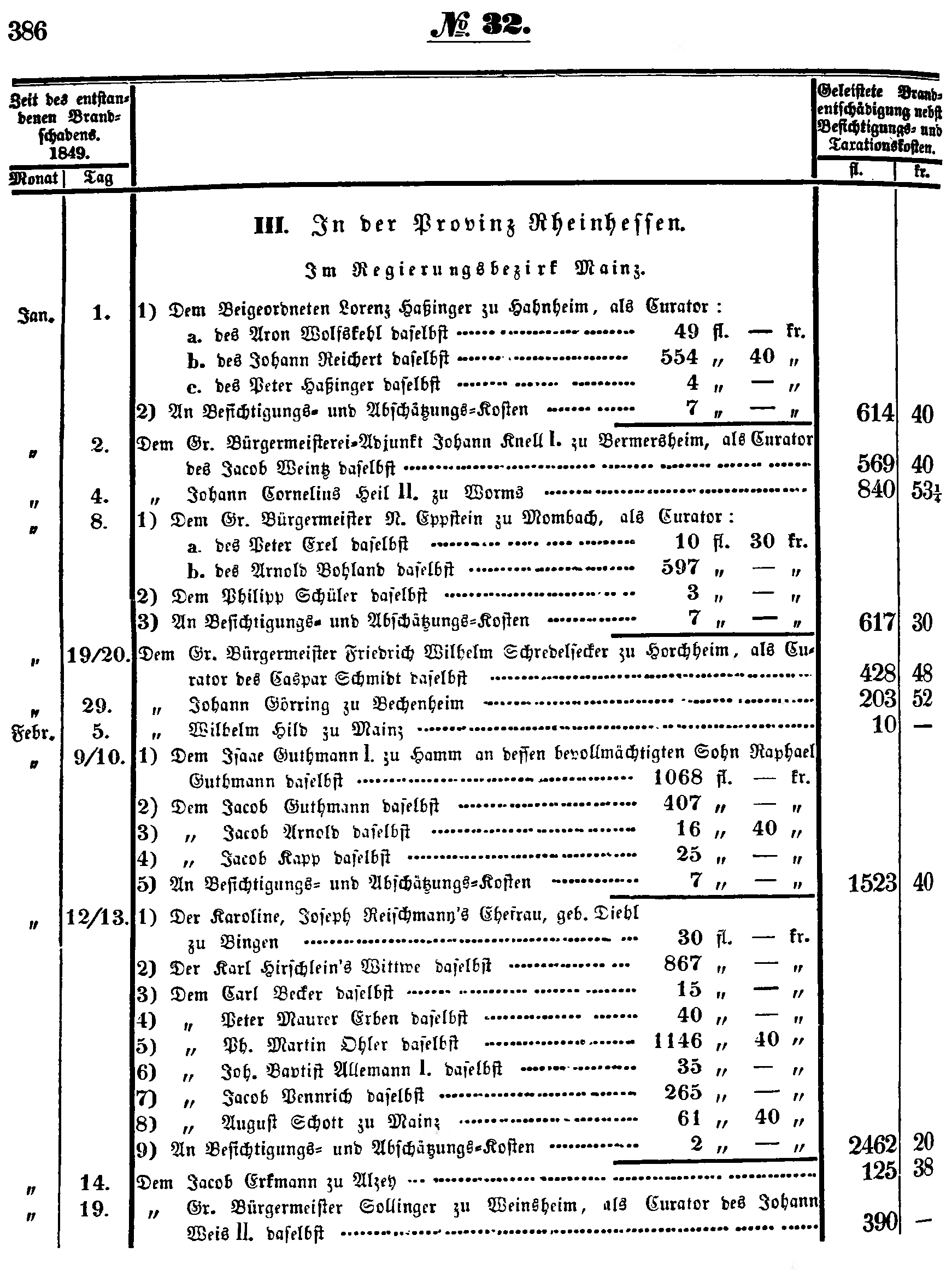 | " | 12/13. | 1) Der Karoline, Joseph Reischmann`s Ehefrau, geb. Diehl zu Bingen | 30 | fl. | - | kr. | |||