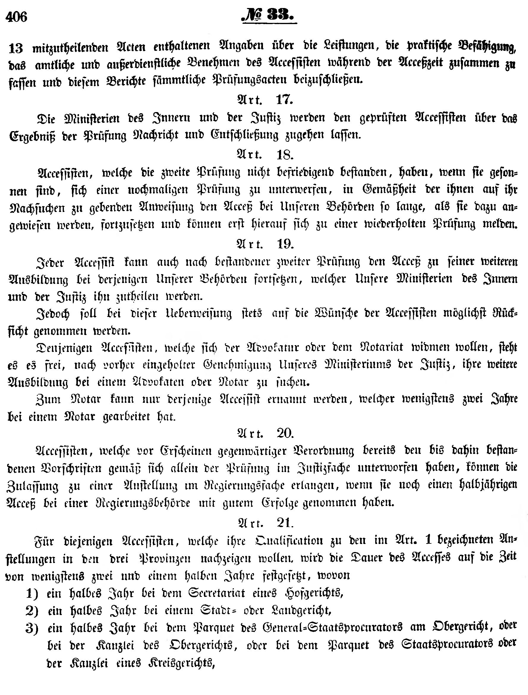 Denjenigen Accessisten, welche sich der Advokatur oder dem Notariat widmen wollen, steht es es frei, nach vorher eingeholter Genehmigung Unseres Ministeriums der Justiz, ihre weitere Ausbildung bei einem Advokaten oder Notar zu suchen.