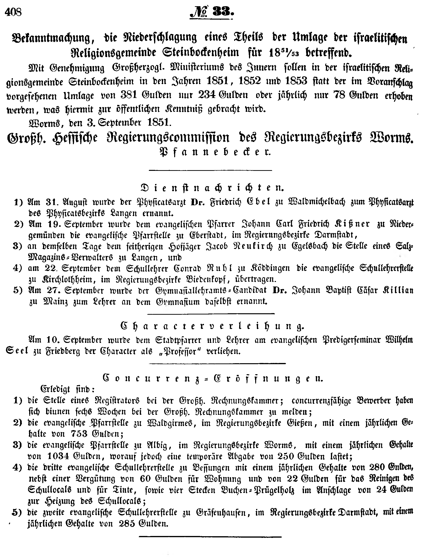 5) Am 27. September wurde der Gymnasiallehramts-Candidat Dr. Johann Baptist Cäsar Killian zu Mainz zum Lehrer an dem Gymnasium daselbst ernannt.