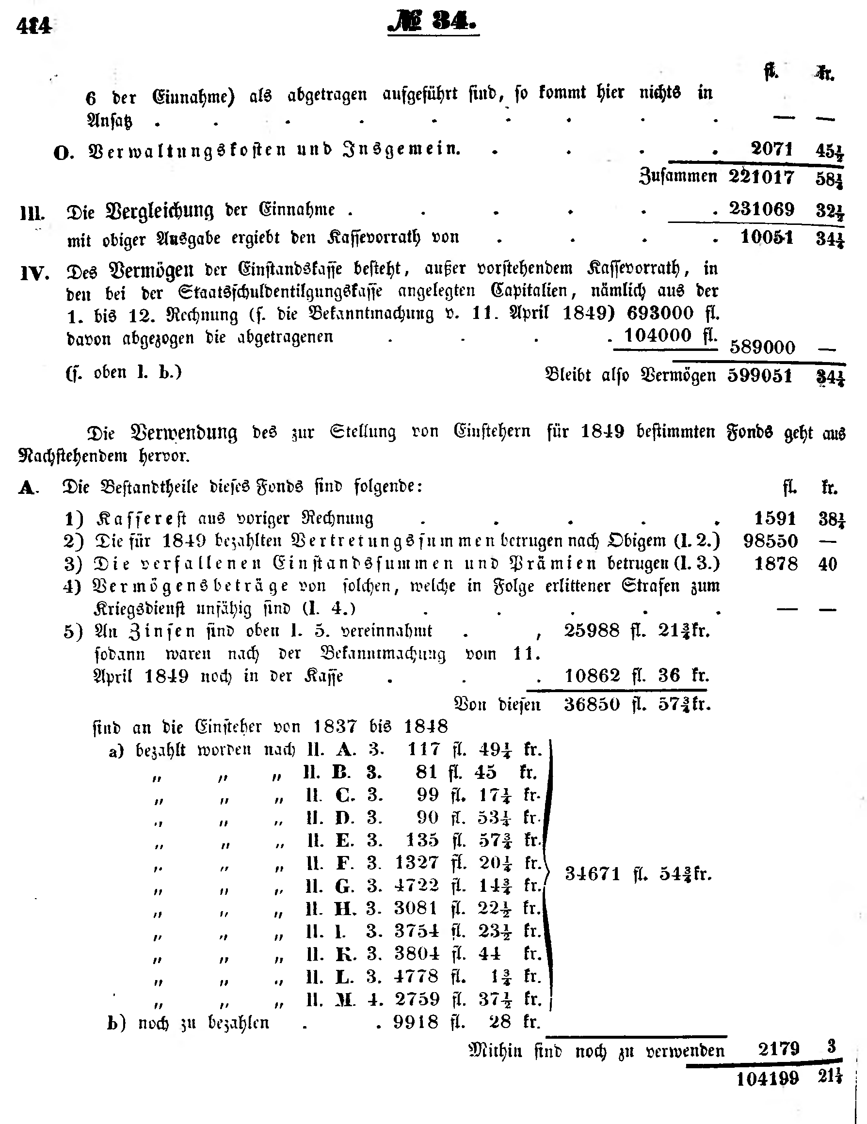 | IV. | Des Vermögen der Einstandskasse besteht, außer vorstehendem Kassevorrath, in den bei der Staatsschuldentilgungskasse angelegten Capitalien, nämlich aus der 1. bis 12. Rechnung (s. die Bekanntmachung v. 11. April 1849) | 693000 fl. | ||||||