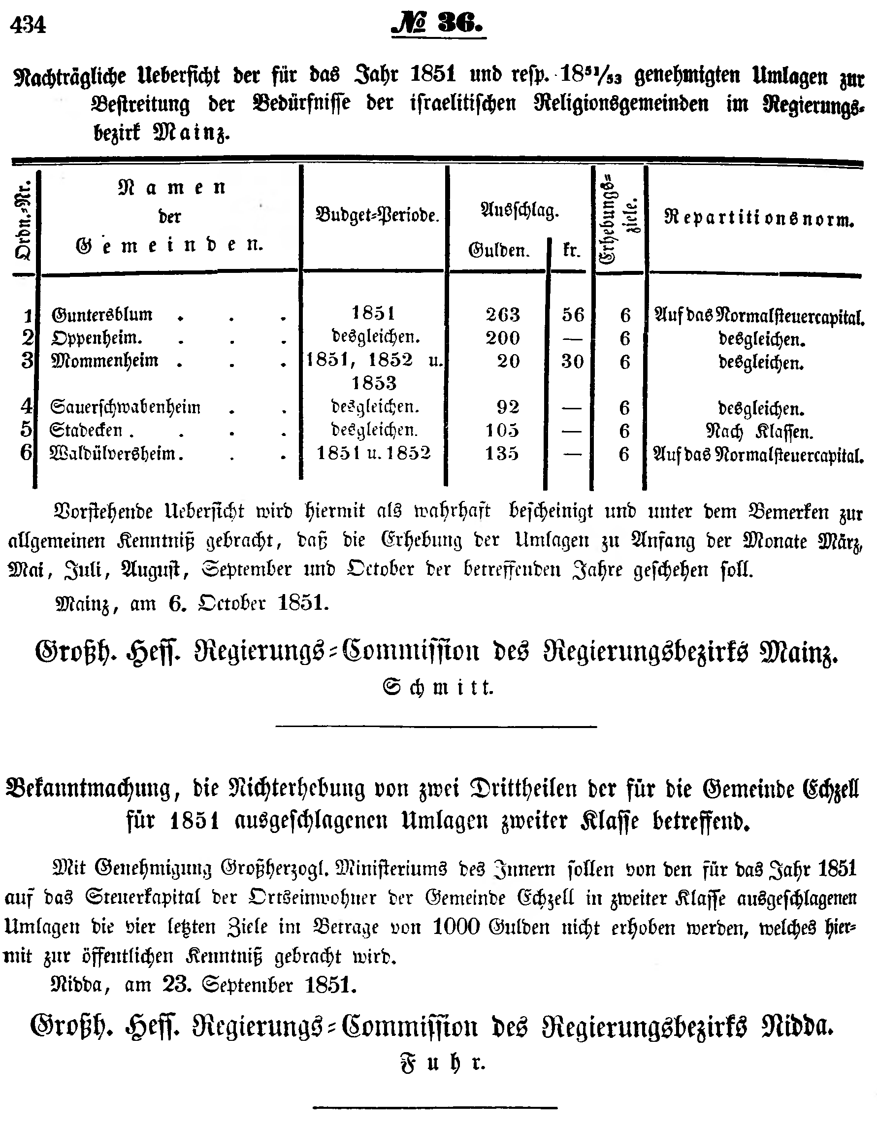 Nachträgliche Uebersicht der für das Jahr 1851 und resp. 1851/53 genehmigten Umlagen zur Bestreitung der Bedürfnisse der israelitischen Religionsgemeinden im Regierungsbezirk Mainz.