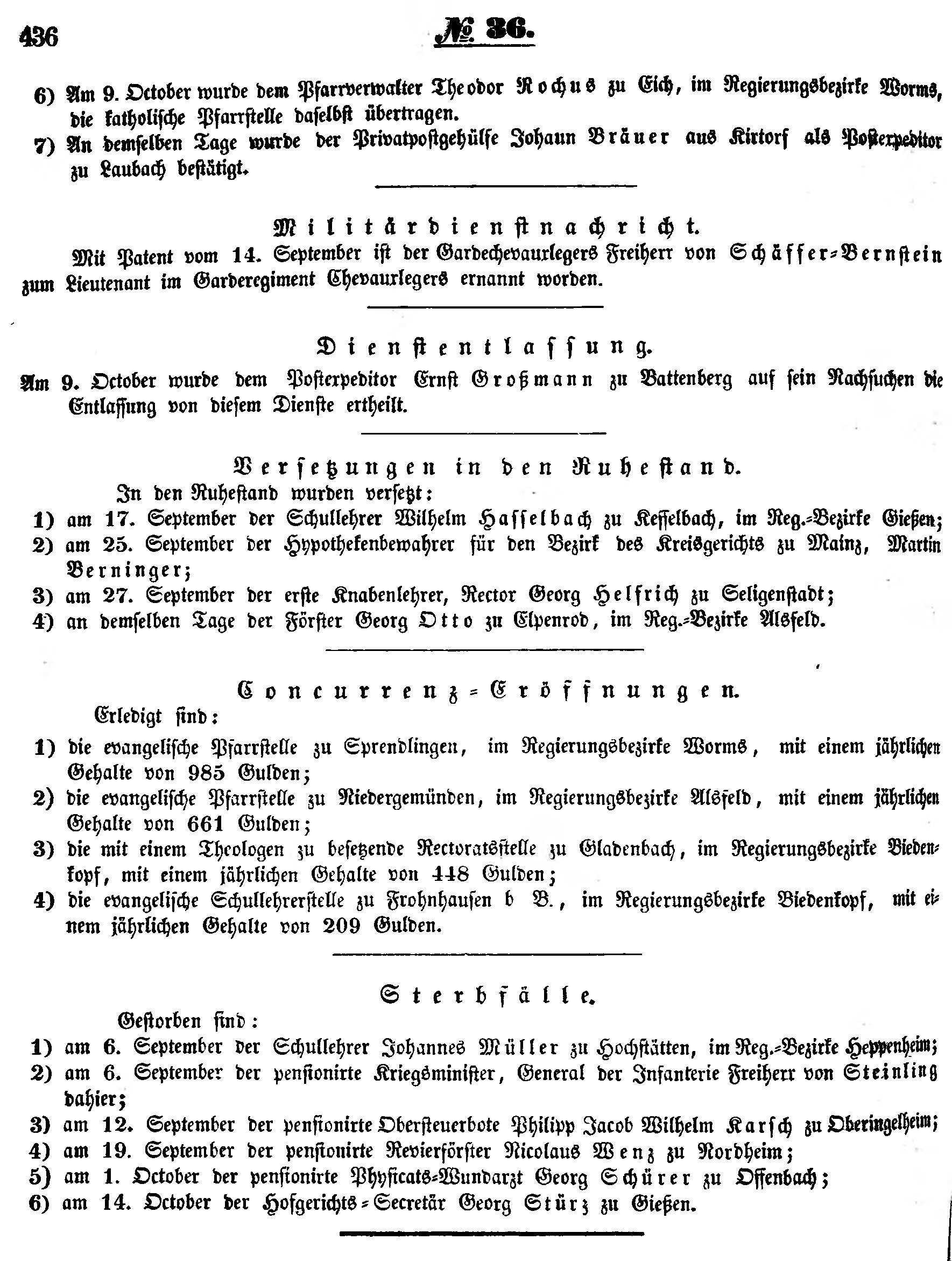 3) die mit einem Theologen zu besetzende Rectoratsstelle zu Gladenbach, im Regierungsbezirke Biedenkopf, mit einem jährlichen Gehalte von 448 Gulden;