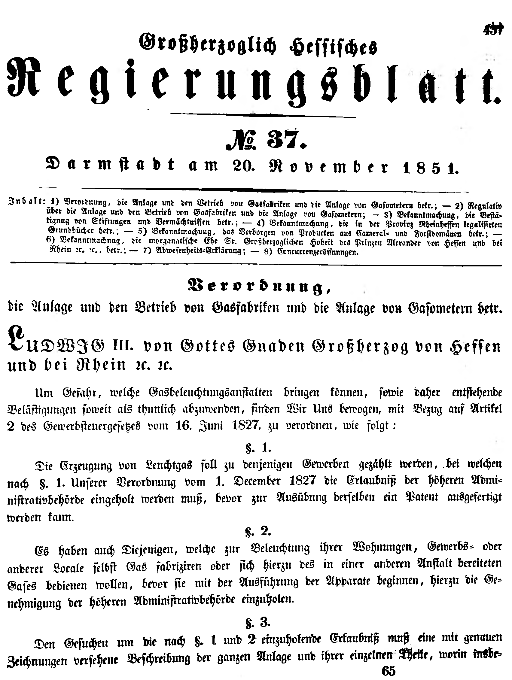 Um Gefahr, welche Gasbeleuchtungsanstalten bringen können, sowie daher entstehende Belästigungen soweit als thunlich abzuwenden, finden Wir Uns bewogen, mit Bezug auf Artikel 2 des Gewerbsteuergesetzes vom 16. Juni 1827, zu verordnen, wie folgt: