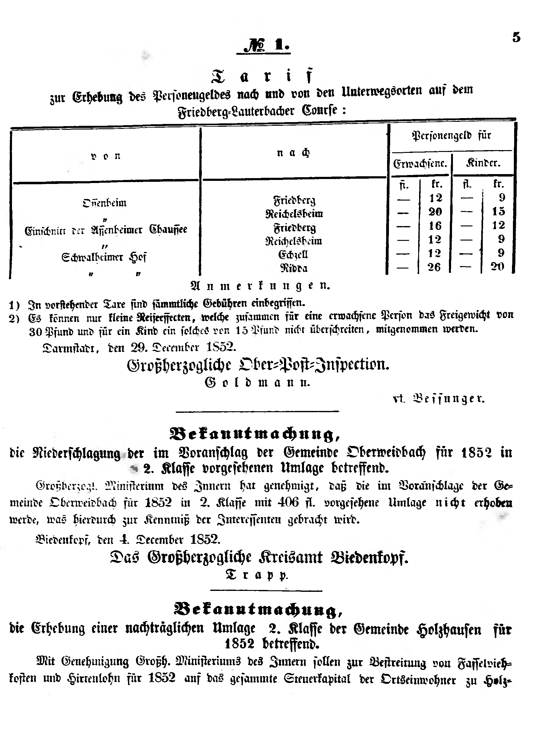 Großherzogl. Ministerium des Innern hat genehmigt, daß die im Voranschlage der Gemeinde Oberweidbach für 1852 in 2. Klasse mit 406 fl. vorgesehene Umlage nicht erhoben werde, was hierdurch zur Kenntniß der Interessenten gebracht wird.