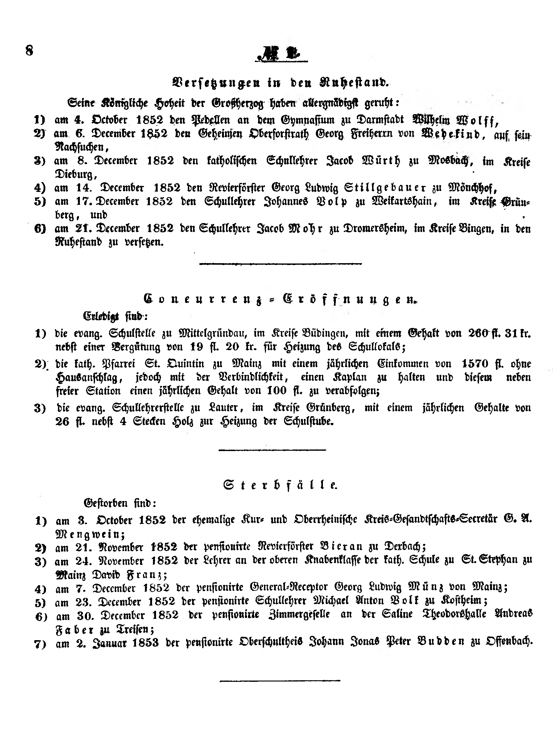 4) am 7. December 1852 der pensionirte General-Receptor Georg Ludwig Münz von Mainz;