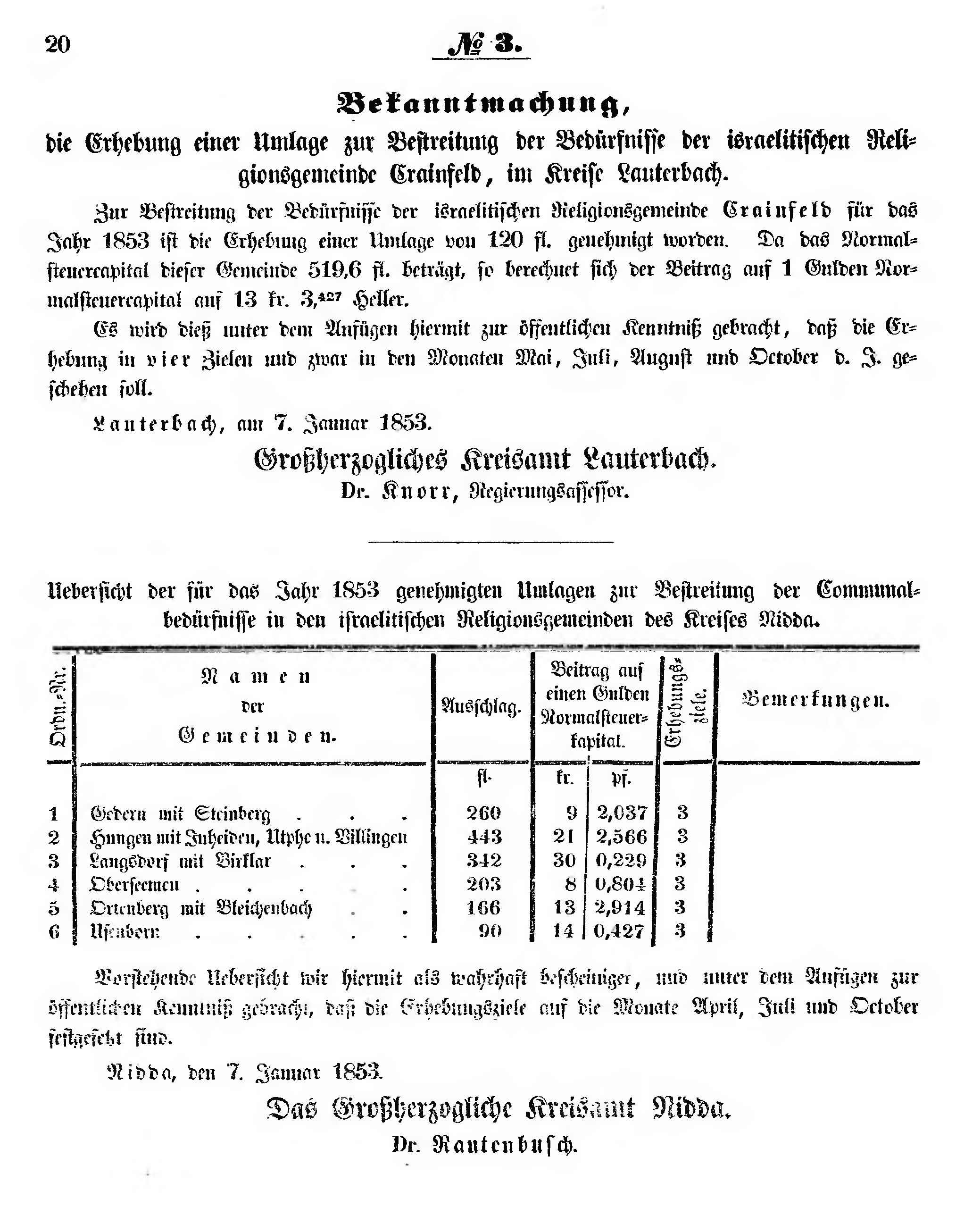 Zur Bestreitung der Bedürfnisse der israelitischen Religionsgemeinde Crainfeld für das Jahr 1853 ist die Erhebung einer Umlage von 120 fl. genehmigt worden. Da das Normalsteuercapital dieser Gemeinde 519,6 fl. beträgt, so berechnet sich der Beitrag auf 1 Gulden Normalsteuercapital auf 13 kr. 3,427 Heller.