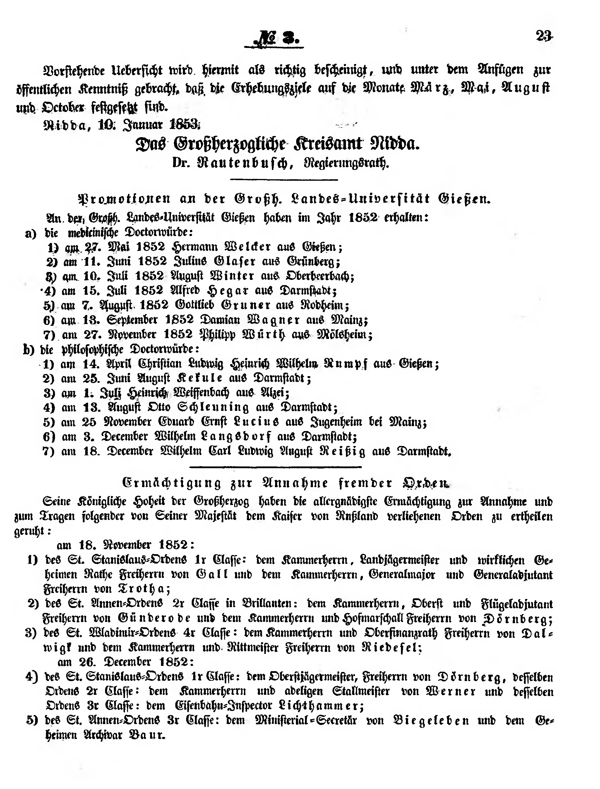 An der Großh. Landes-Universität Gießen haben im Jahr 1852 erhalten: