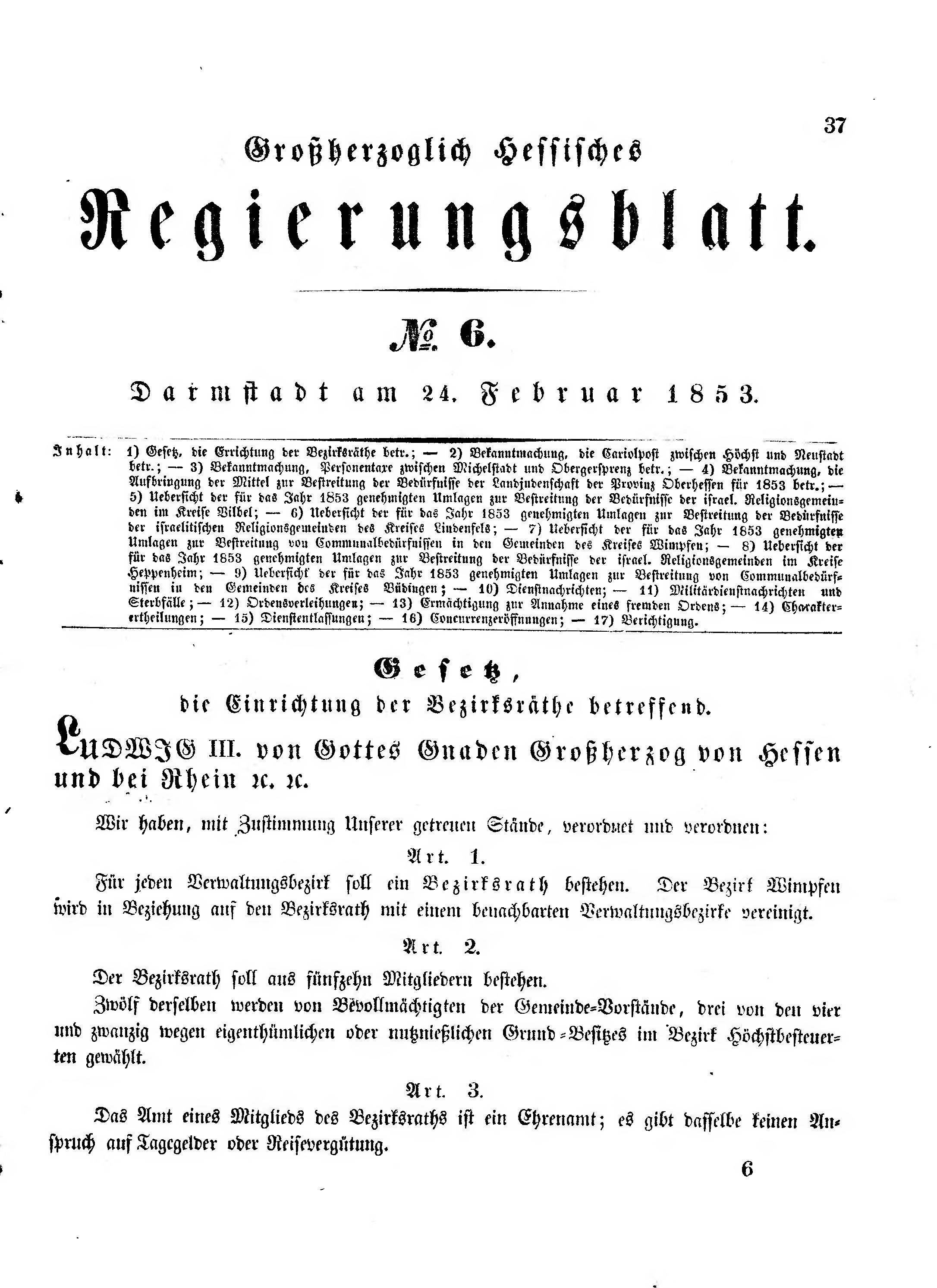 Inhalt: 1) Gesetz, die Errichtung der Bezirksräthe betr.; - 2) Bekanntmachung. die Cariolpost zwischen Höchst und Neustadt betr.; - 3) Bekanntmachung, Personentaxe zwischen Michelstadt und Obergersprenz betr.; - 4) Bekanntmachung, die Aufbringung der Mittel zur Bestreitung der Bedürfnisse der Landjudenschaft der Provinz Oberhessen für 1853 betr.; - 5) Uebersicht der für das Jahr 1853 genehmigten Umlagen zur Bestreitung der Bedürfnisse der israel. Religionsgemeinden im Kreise Vilbel; - 6) Uebersicht der für das Jahr 1853 genehmigten Umlagen zur Bestreitung der Bedürfnisse der israelitischen Religionsgemeinden des Kreises Lindenfels; - 7) Uebersicht der für das Jahr 1853 genehmigten Umlagen zur Bestreitung von Communalbedürfnissen in den Gemeinden des Kreises Wimpfen; - 8) Uebersicht der für das Jahr 1853 genehmigten Umlagen zur Bestreitung der Bedürfnisse der israel. Religionsgemeinden im Kreise Heppenheim; - 9) Uebersicht der für das Jahr 1853 genehmigten Umlagen zur Bestreitung von Communalbedürfnissen in den Gemeinden des Kreises Büdingen; - 10) Dienstnachrichten; - 11) Militärdienstnachrichten und Sterbfälle; - 12) Ordensverleihungen; - 13) Ermächtigung zur Annahme eines fremden Ordens; - 14) Charakterertheilungen; - 15) Dienstentlassungen; - 16) Concurrenzeröffnungen; - 17) Berichtigung.