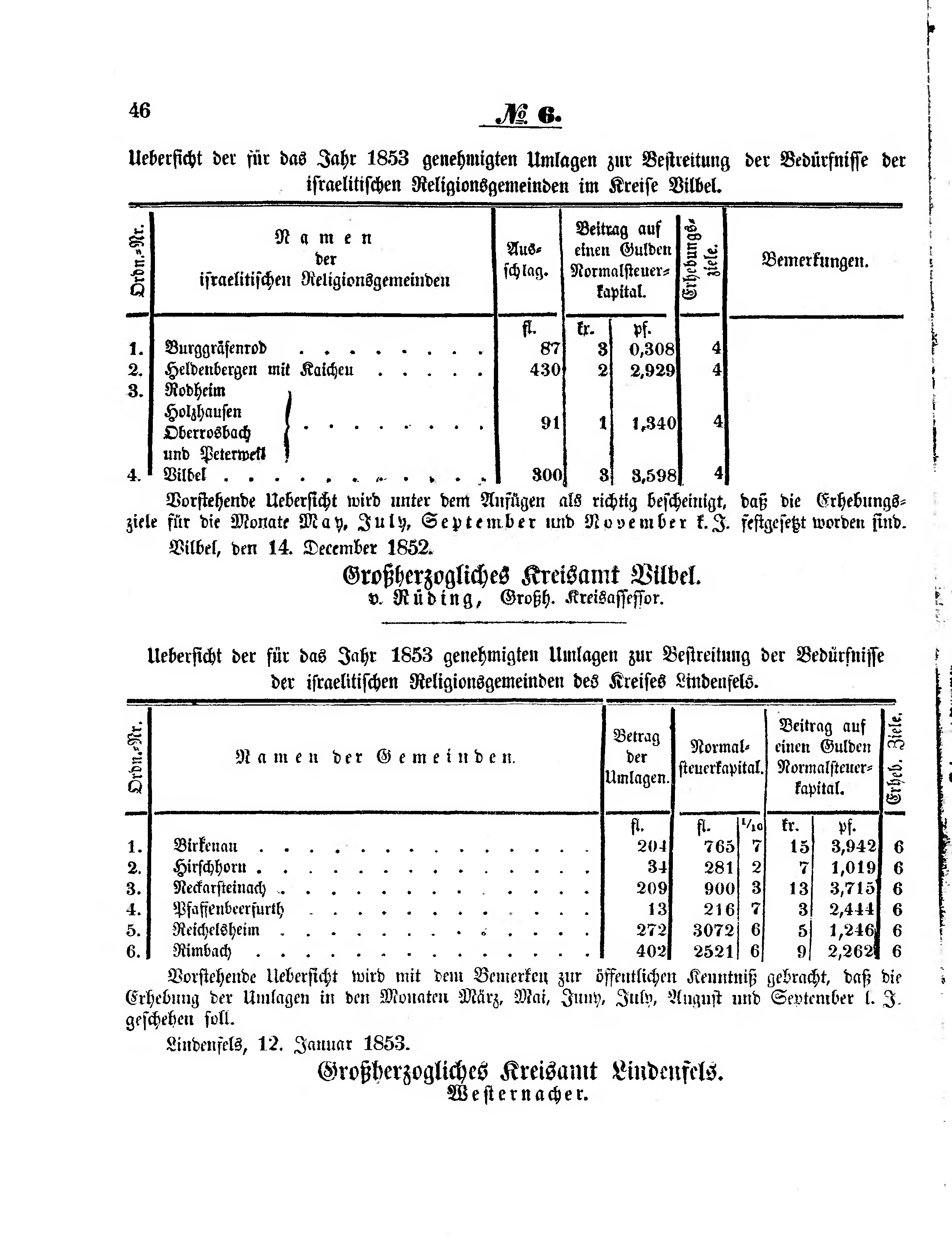 Uebersicht der für das Jahr 1853 genehmigten Umlagen zur Bestreitung der Bedürfnisse der israelitischen Religionsgemeinden im Kreise Vilbel.
